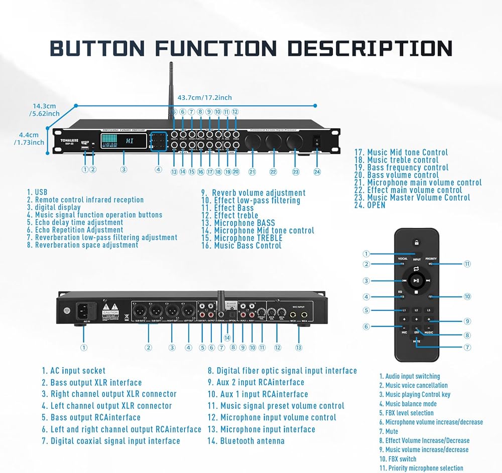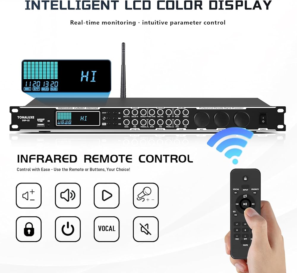 Infrared Remote Control & High-Resolution LCD Display: Operate your audio system with ease using the infrared remote, offering fast access to key functions. The high-resolution LCD color screen provides real-time monitoring and intuitive parameter visibility, ensuring precise control during karaoke, performances, and home entertainment.