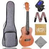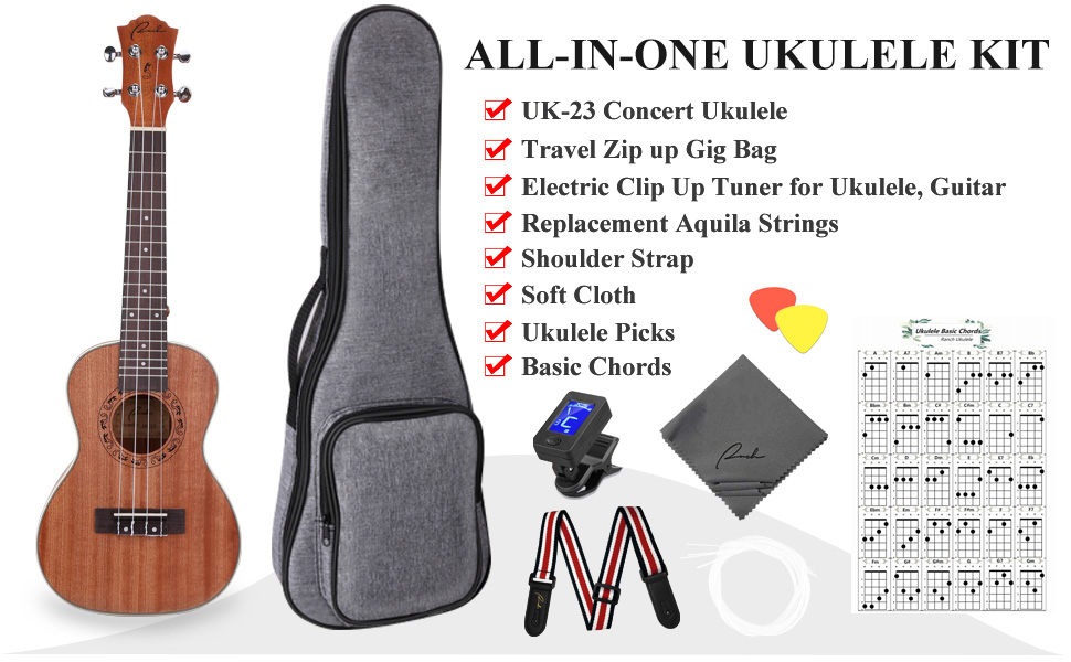 Complete Ukulele Set: The Ranch Concert Ukulele Kit includes everything you need: one Ranch UK-23 Concert ukulele with Aquila strings installed, a well-padded 10mm gig bag, a digital tuner with battery, an extra set of 4 Aquila strings, a strap, a microfiber polishing cloth, and step-by-step 12 online lessons. We've prepared everything a beginner needs