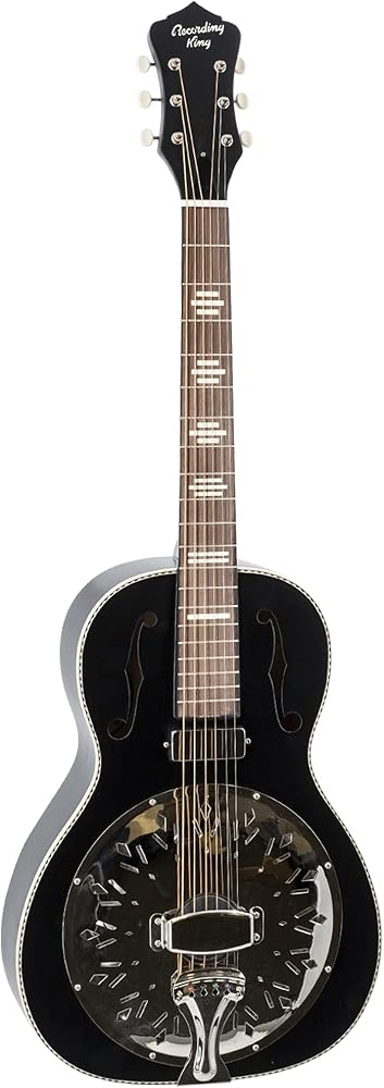 The all new Minnie Bucker resonator is packed with down-low, dirty, swampy tone, thanks to the hand-spun European resonator cone and great sounding mini humbucker in the neck. If you're looking to add a bit of grit to your playing, the Minnie Bucker's mini humbucker can go from just a swampy touch of dirt, to crazy blues crunch. The responsive pickup helps tone freaks like you dial in the perfect tone using only your hands. Adding a pickup would mean nothing if these guitars didn't start with the most fundamental building blocks of great resonator tone. The top-shelf Recording King hand-spun European resonator cone delivers classic throaty, honky resonator goodness. (Always check your cones, make sure your next resonator has a spun cone, never stamped! --Travis Atz, RK Director of Product) Likewise, the small body design pairs perfectly with the pedestal soundwell and 12-fret neck joint for a guitar that's lively, loud and resonant, but small enough to take anywhere. It sounds great acoustically too, thanks to a spruce soundboard and a biscuit bridge, so you'll have all the classic reso sound on tap whether you plug in or not. It wouldn't be a Dirty 30s guitar without the classic RK design mojo, and the Minnie Bucker is no exception. Available in ultra-swampy black matte, super cool Wabash Blue (both with checkerboard purfling) and limited-run classic Brownburst finishes.
