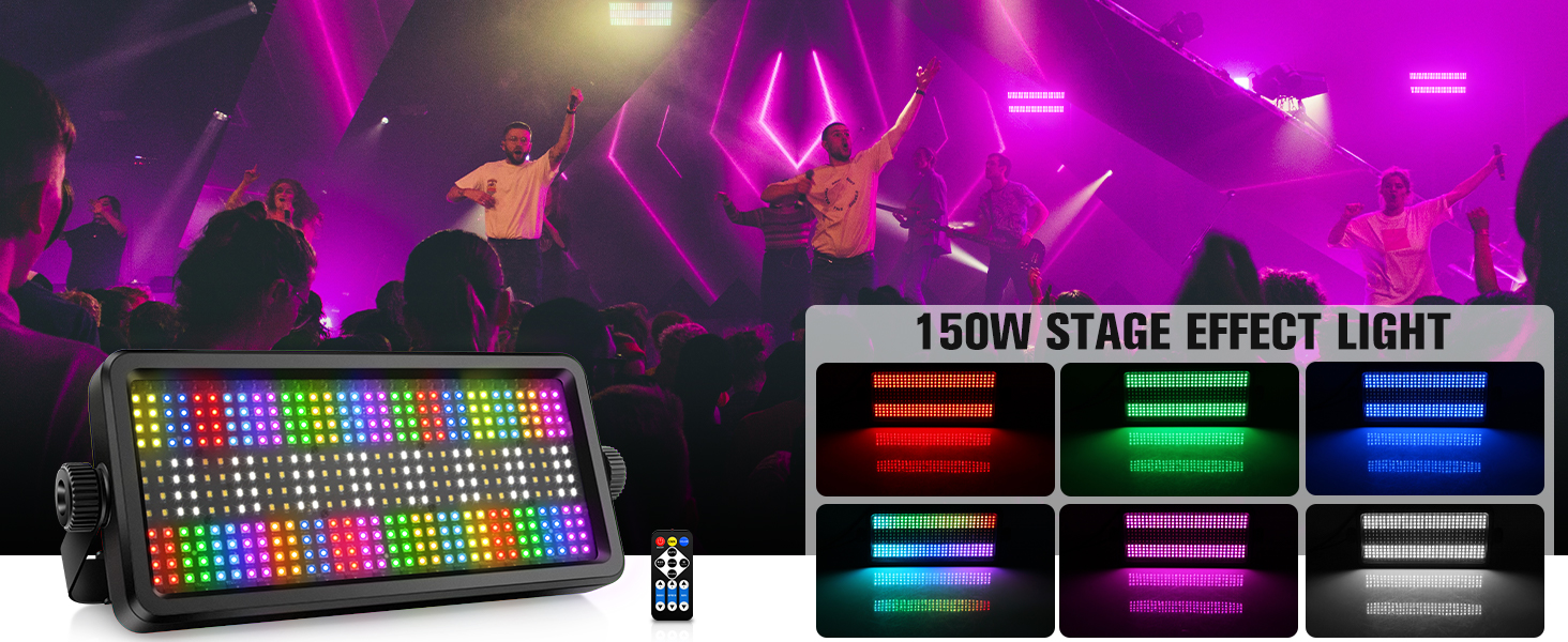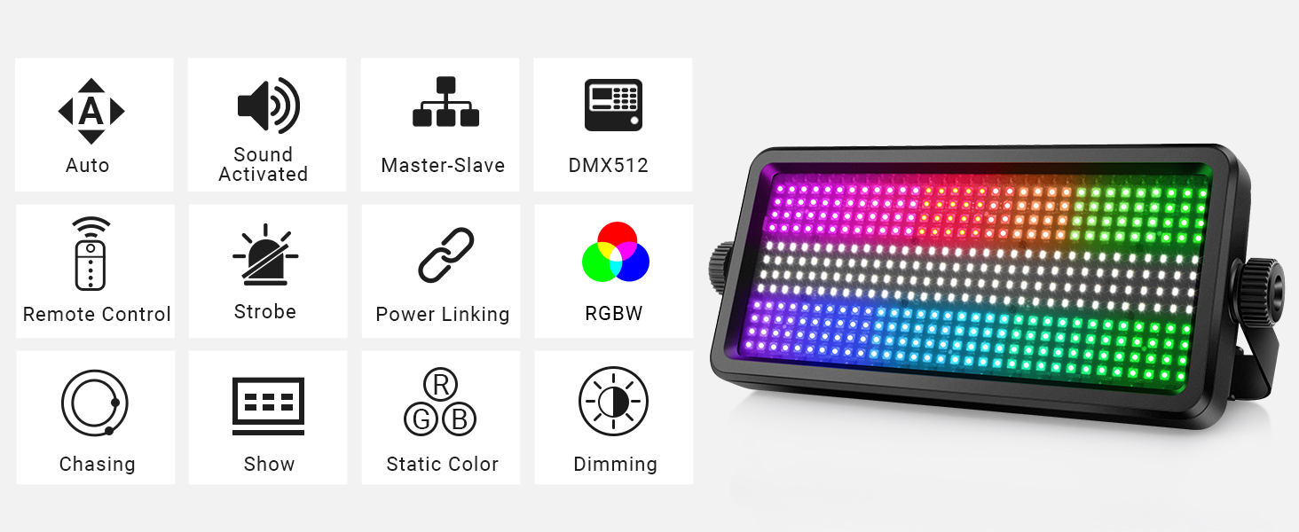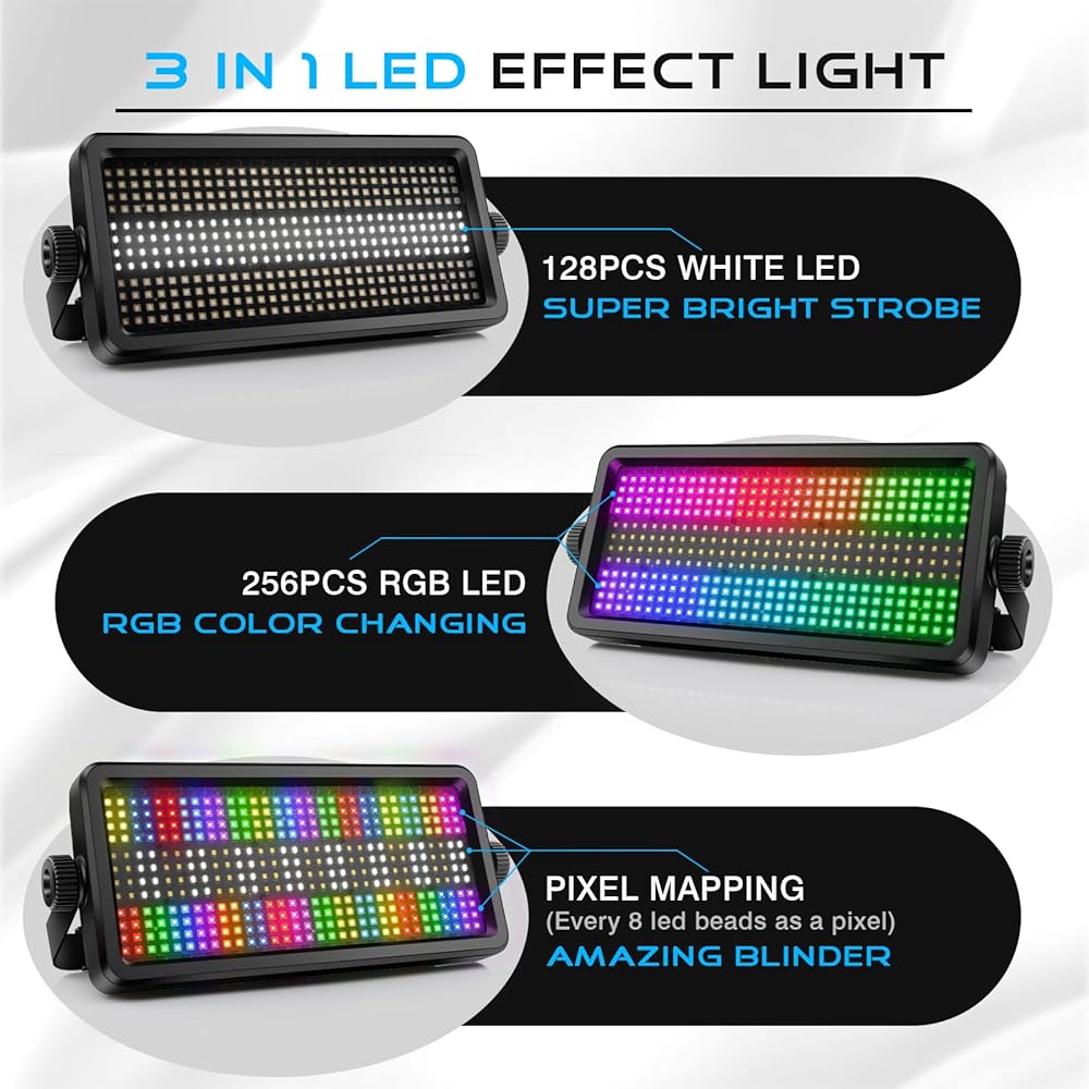 LED Stage Strobe Light: Equipped with 256 RGB LEDs and 128 cool white SMD LEDs. Combines strobe, wash, and chase effects with bright RGB and cool white LEDs - perfect for stages, events, and clubs.