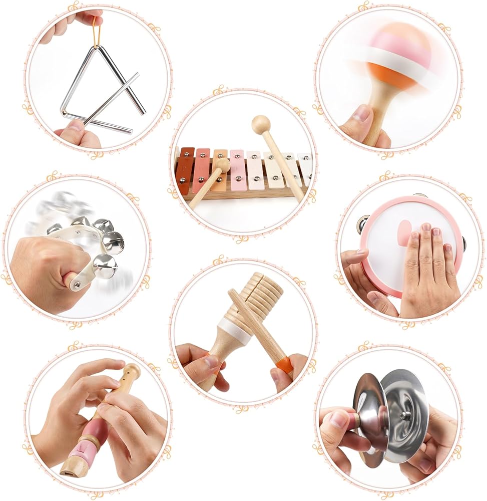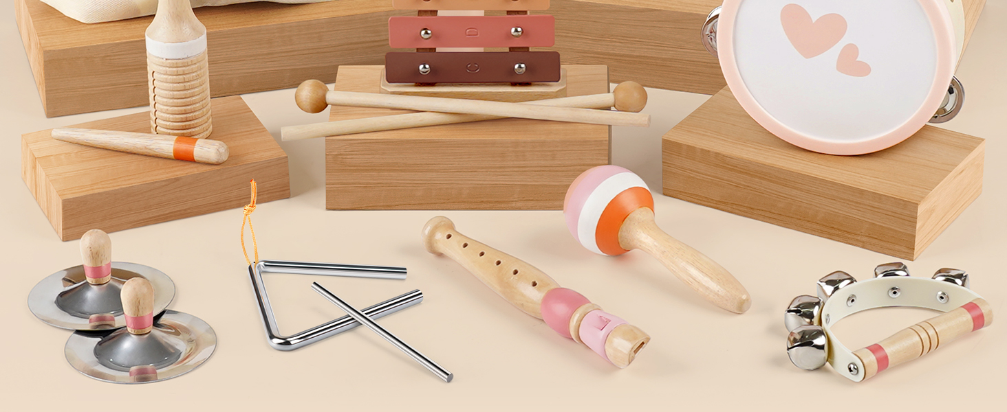 【Early Music Education】 Research indicates that early exposure to music positively influences children's brain development. As an early development toy set, toddler can develop their sense of hearing and touch by playing with these musical instruments, which help to develop their sensitivity to music and sense of rhythm, and improve their creativity and ability to recognize musical instruments.