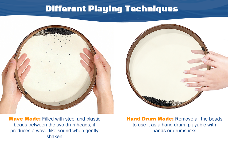 【Two Playing Styles】You can add or remove beads through the reserved holes on the shell to control the number of beads, producing either soft or intense sounds. Hold the edges of the meditation drum with both hands and shake it with varying pressure and angles to effortlessly create rich ocean wave sounds. The drumhead is pre-tuned, and after removing all beads, it can also be used as a hand drum instrument