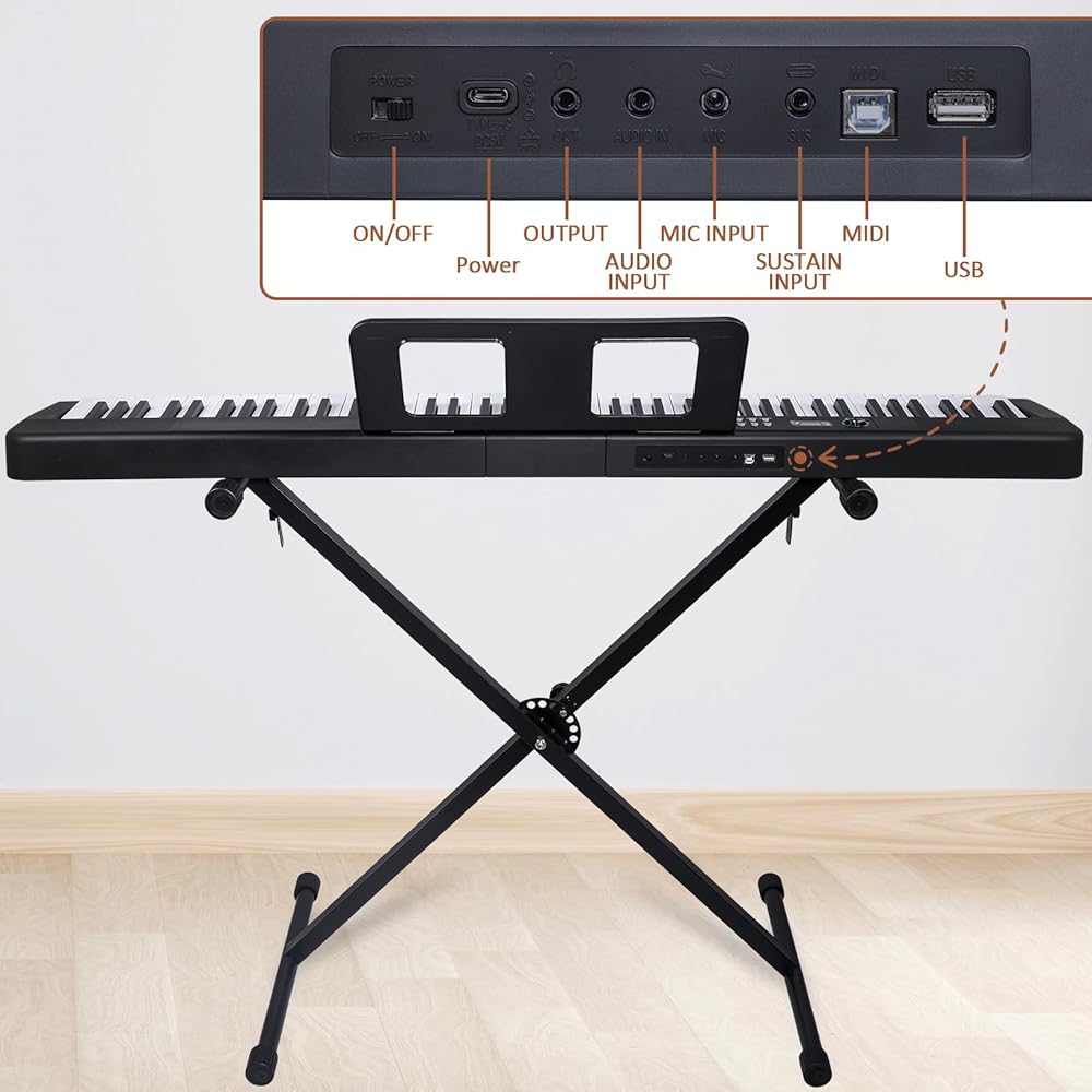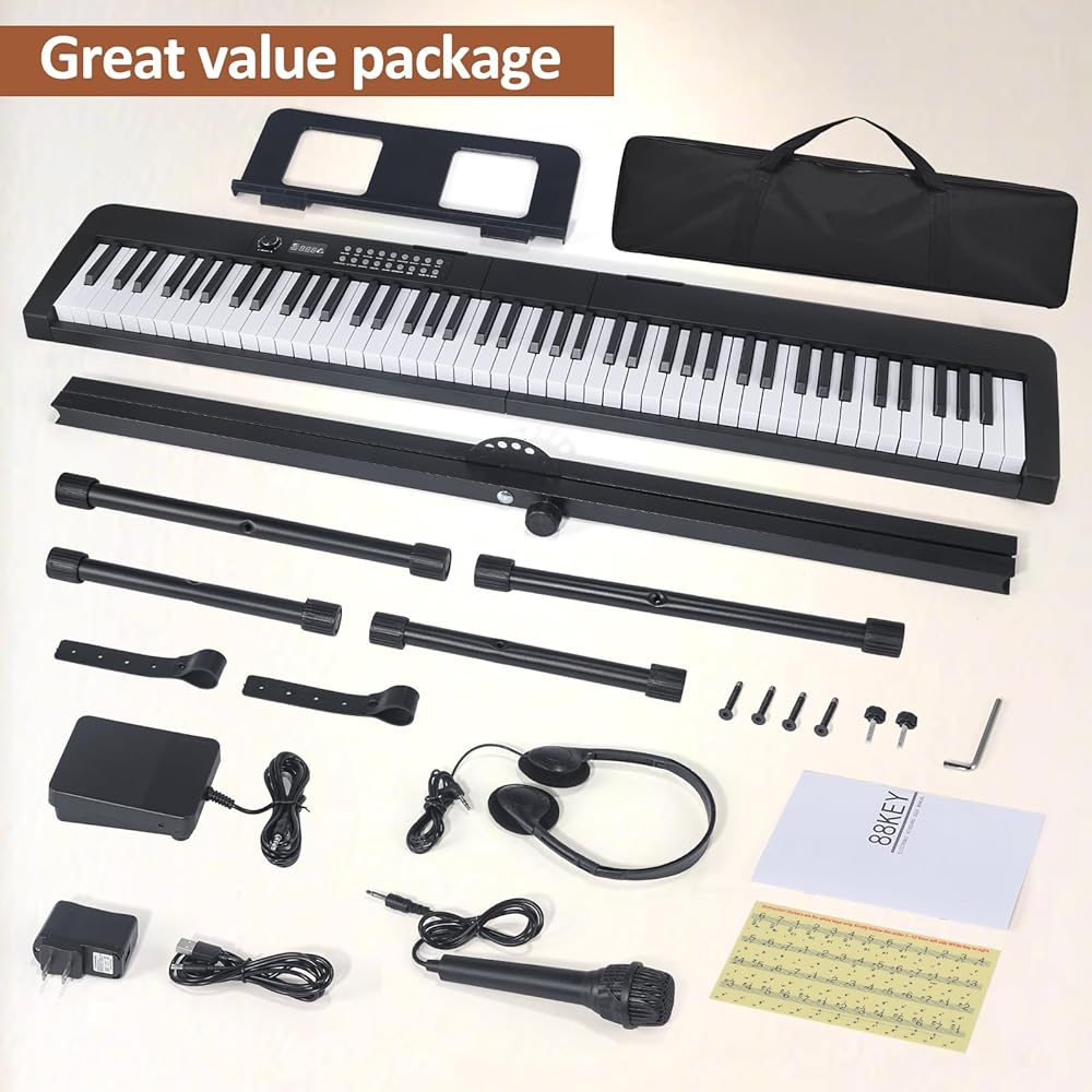 • 🎹【Perfect Kit for Beginners】The 88 set is the perfect starter package, including everything a beginner needs to get started. It features a sturdy double-X stand that provides extra stability, along with a complete set of key stickers that help beginners simplify and accelerate their piano mastery. Additionally, the kit comes with a music rest, headphones, a USB power adapter, sustain pedal and a keyboard bag.