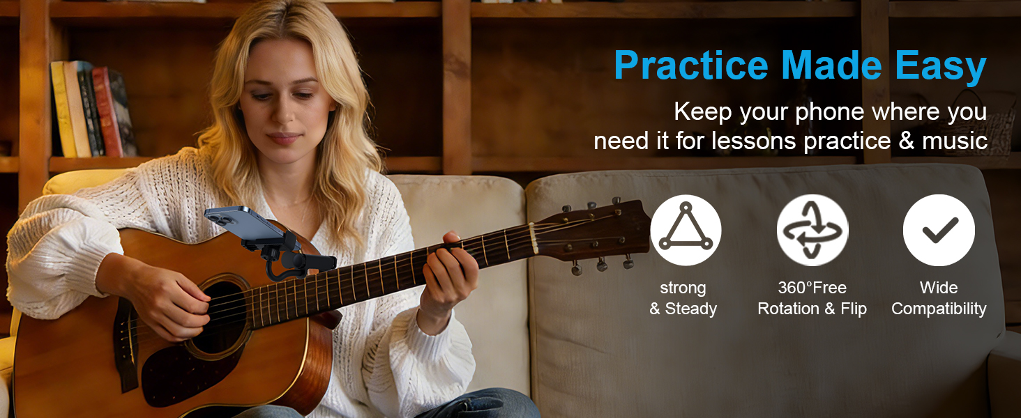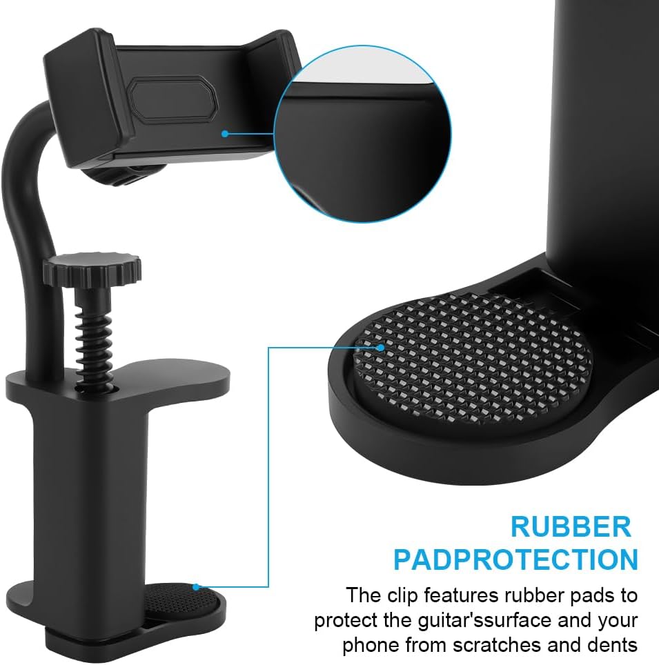 Broad Smartphone Compatibility with Bonus Guitar Picks: The expandable phone clip securely holds most smartphones, providing a hands-free solution for reading digital sheet music, following online chords, or filming close-up fretboard shots. Comes with 2 bonus guitar picks, making it a thoughtful gift for any guitarist