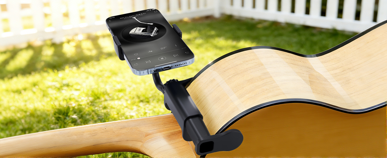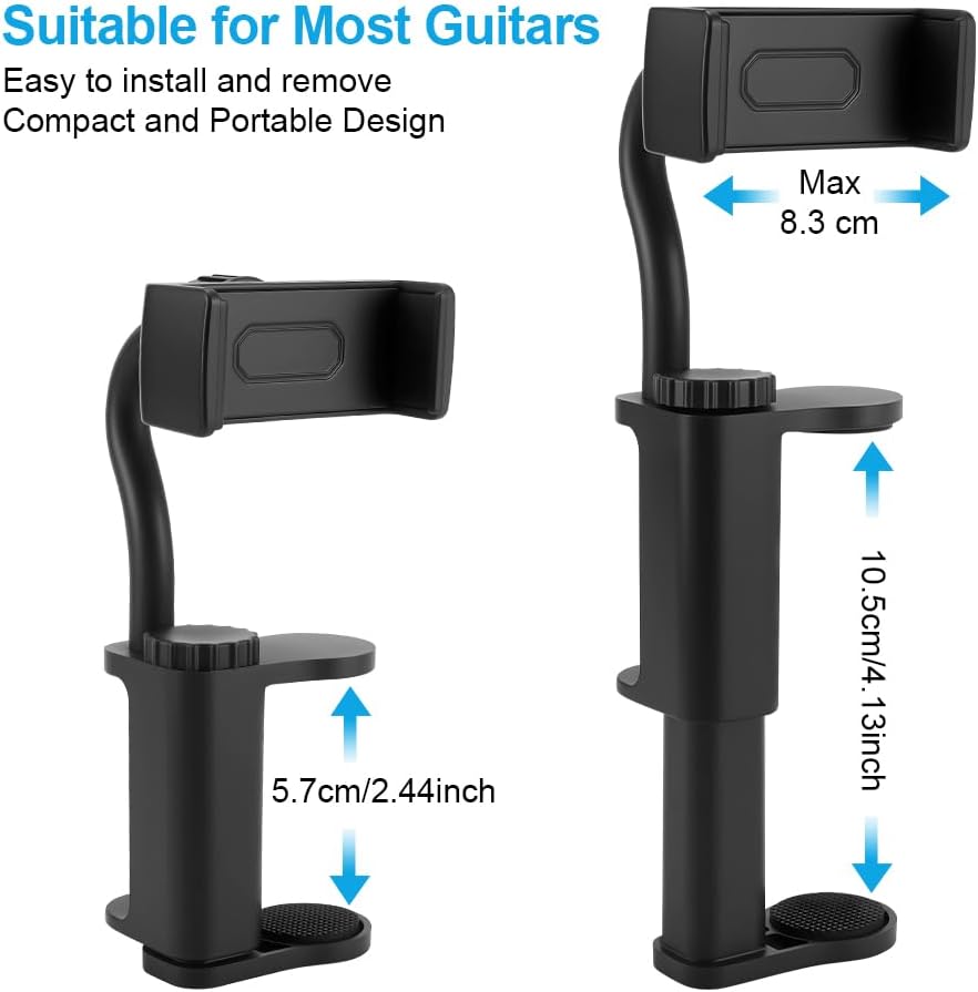Universal Compatibility with Most Guitars and Ukuleles: This versatile guitar phone mount is compatible with most acoustic, electric, bass, and ukulele instruments. The adjustable clamp fits a thickness of 2.36 Inch to 4.13 Inch (please verify your instrument's body thickness before purchase)