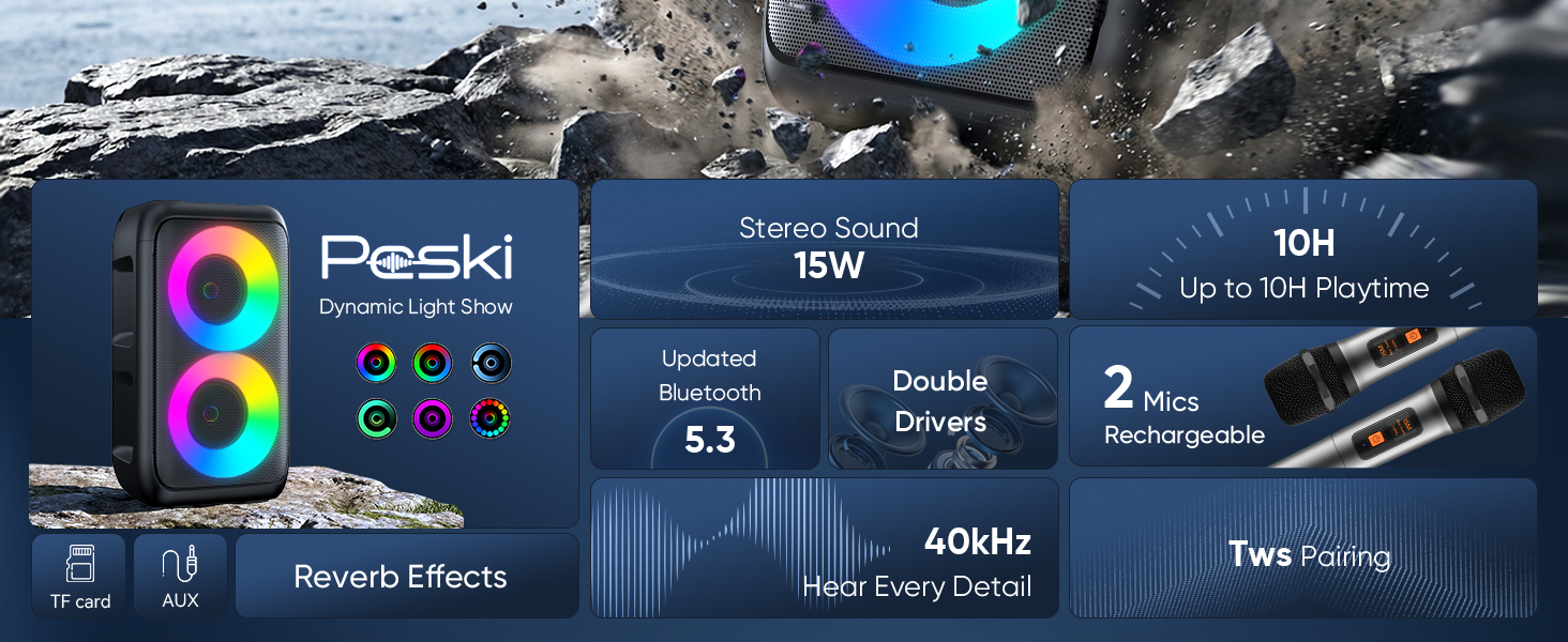 TWS Stereo Mode for Wider Soundstage: Want to upgrade your karaoke nights? Support True Wireless Stereo (TWS) technology—pair two karaoke machine to create immersive stereo sound. Perfect for larger parties or outdoor events, the expanded soundstage surrounds you with music, making singing more exhilarating. No extra cables needed—just sync two units and enjoy the enhanced audio experience!
