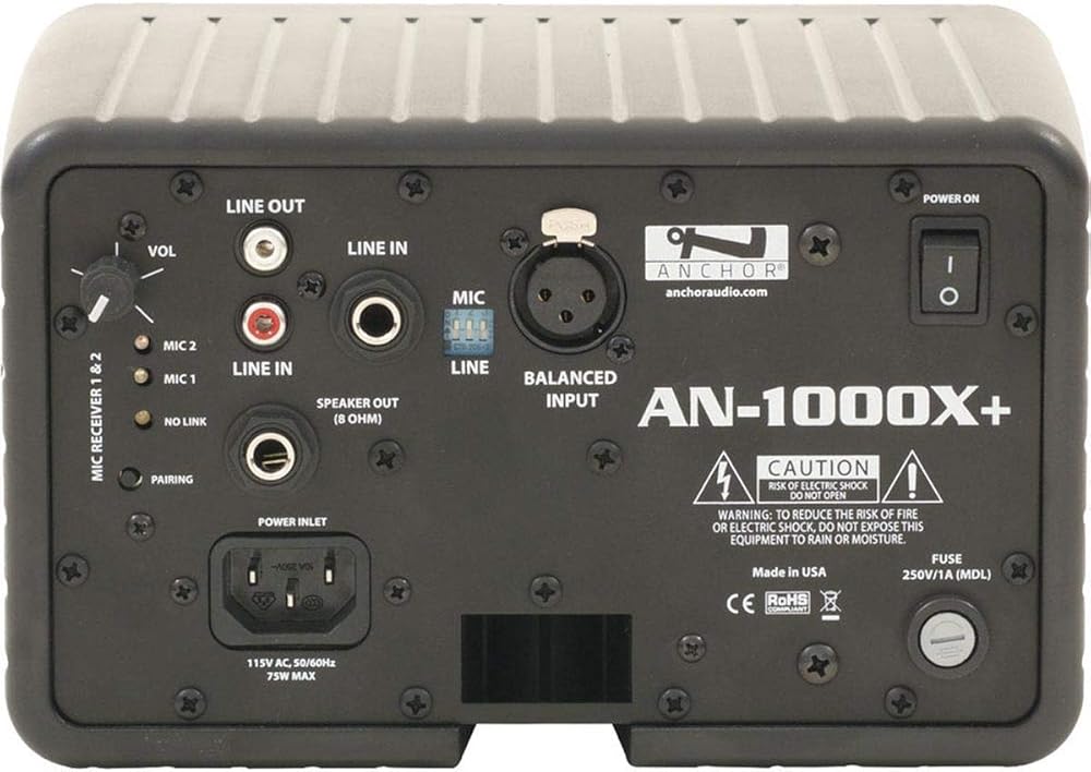Anchor audio AN-1000XU2+ with 2 built-in wireless receivers. Lightweight speaker delivers 107 db od sound. Reaches a crowd of over 250 people, 107 dB of clear sound, 2 built-in wireless receivers for wireless microphone options, 50 watt amplifier, bass and treble controls, 4.5 inch ac powered woofer and 10mm dome tweeter. RCA and 1/4 inch line inputs configurable for mic/xlr input. Configurable 220vpliant durable abs housing inputs for connecting a video projector, cd/dvd player, ipod. , mp3, or pc. Speaker output speaker (sold separately). Mountable on a stand, on the wall, or can be placed on a shelf. Reaches crowds of 250+ 107 dB of clear sound 50 W AC mode 2 built-in wireless receivers, 1.9 GHz 1/4-inch line input, one 4.5-inch woofer, one 10 mm dome tweeter Integrated mounting screws for easy installation (bracket with Allen wrench sold separately) 1/4-inch line output to daisy chain multiple units Made in the USA D: 9" x 8" x 5.5"