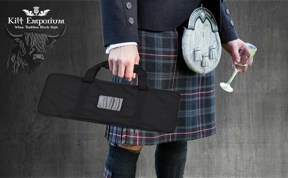 Crafted for Convenience: Our kilt sporran bag for Scottish kilt and bagpipe accessories constructed from durable materials with a comfortable handle, heavy duty zipper and solid puller making it easy to transport your kilt accessories securely.