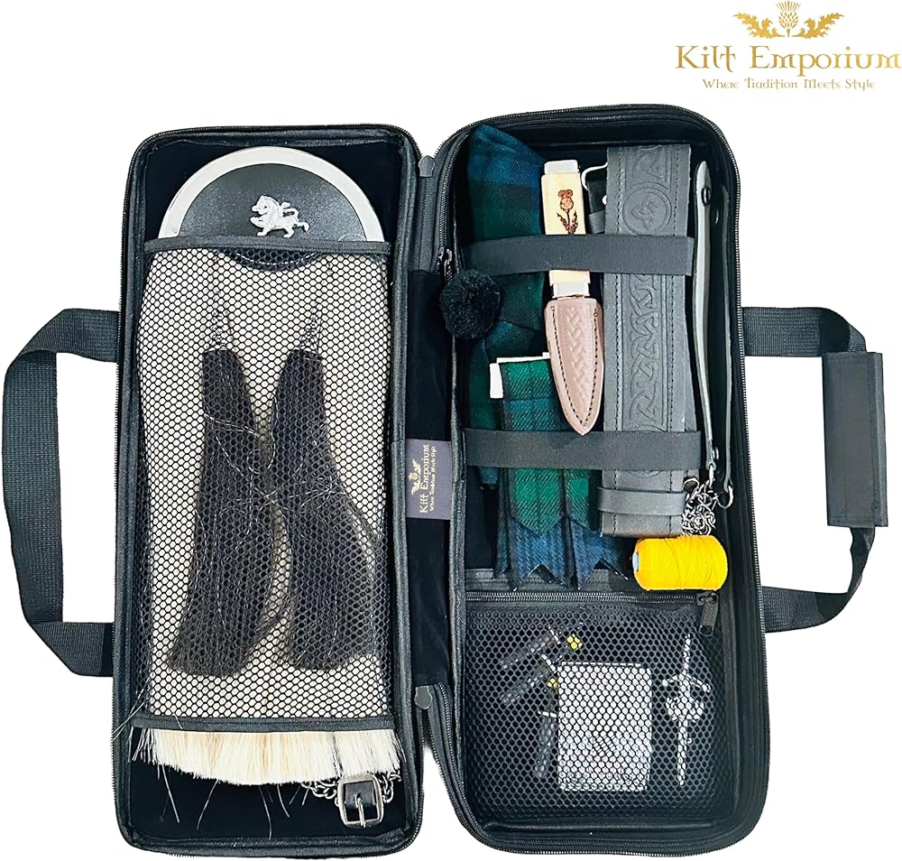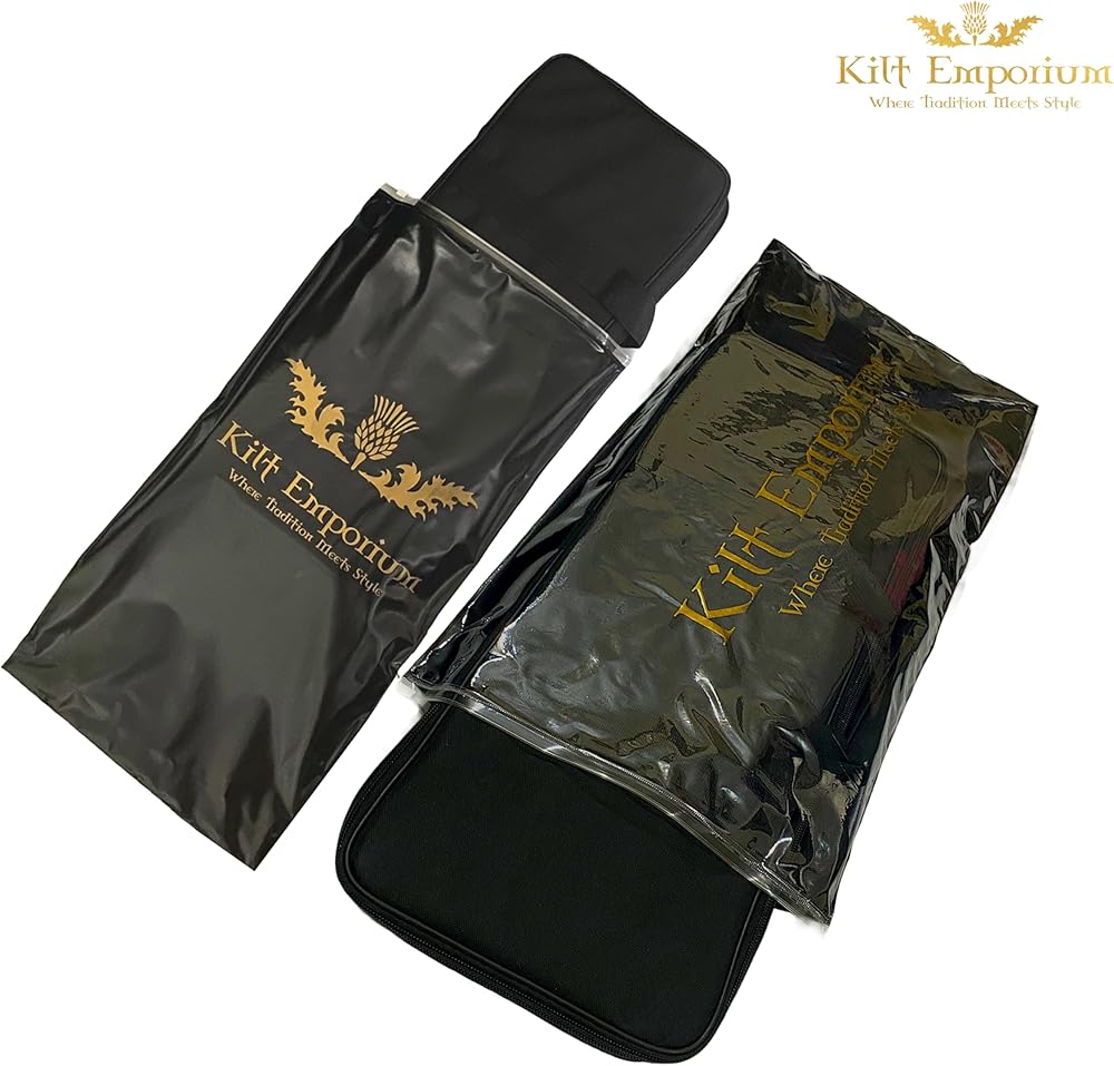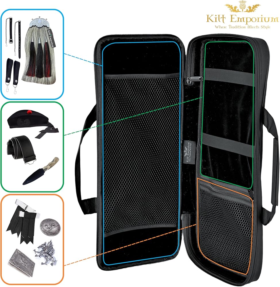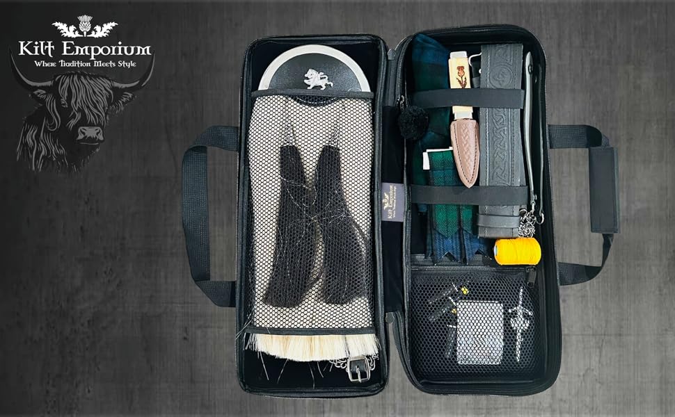 All-in-One Bag for Kilt Accessories: This kilt sporran bag for Scottish kilt and bagpipe Accessories is designed to hold your sporran, kilt pin brooch, Kilt belt buckle, flahes, glengarry, sgian dubh, hose tops, spats, and even a flask, keeping everything organized in one place.
