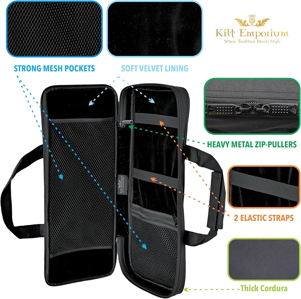 Spacious and Secure: Measures L20” x W8", offering plenty of room for all your long sporran and other bagpipe accessories. This kilt sporran bag for Scottish kilt and bagpipe Accessories provides ample space to protect your valuables from dust, dirt, and scratches, ensuring they stay clean and ready for use.