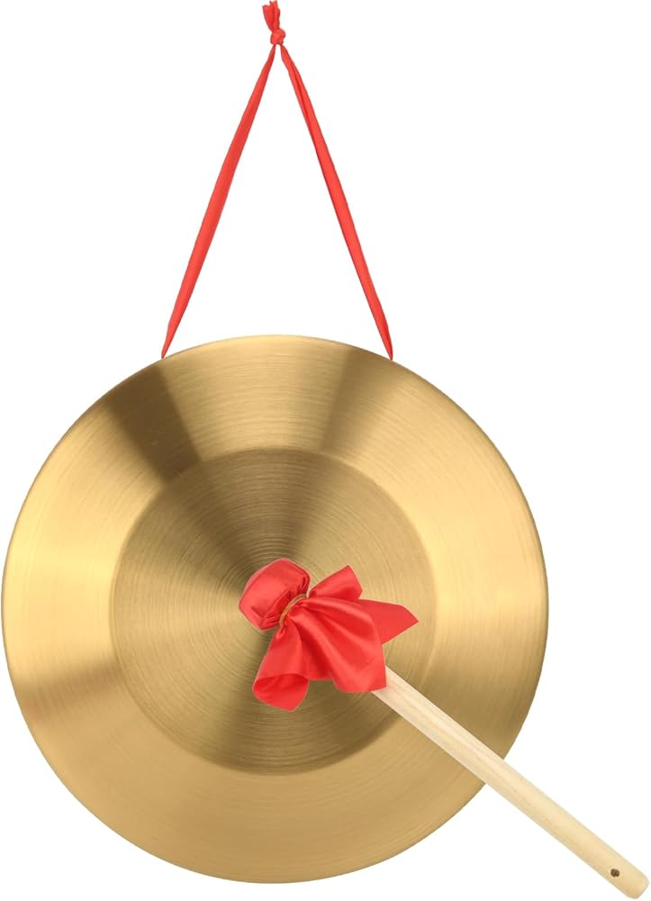 Complete Gong Set: The copper steel alloy Chinese gongs instrument set includes one gong which is 12.6 inch diameter, one wood beater, one red ribbon, meeting all your needs