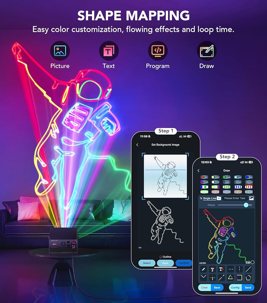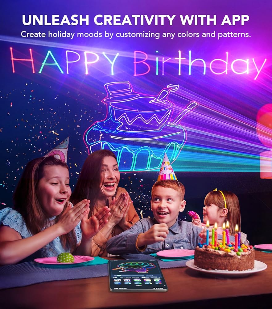 【APP Control & Custom Design】Create your own laser show effortlessly with a mobile APP! Draw patterns with your fingers, input text (like "Happy Birthday"), or upload images—no experience needed to master professional stage laser lights. Make weddings, parties, and holiday 【APP Control & Custom Design】Create your own laser show effortlessly with a mobile APP! Draw patterns with your fingers, input text (like "Happy Birthday"), or upload images—no experience needed to master professional stage laser lights. Make weddings, parties, and holiday events truly uniqueevents truly unique