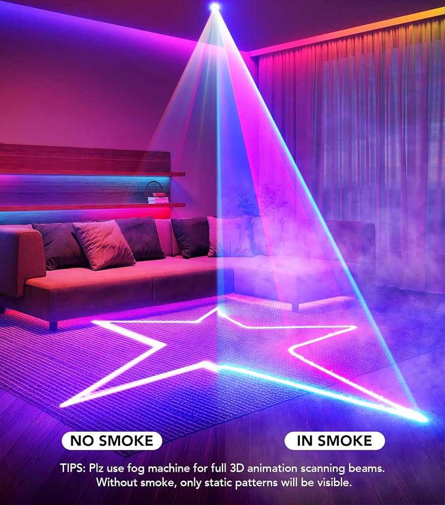 【Important Notice】①Hand-drawn patterns and text templates cannot be saved to your custom program library. Only patterns created through the Personalized Programming interface are storable. Kindly review this feature specification before making your purchase. ②The full 3D animation effect, you need to use it with a fog machine; without smoke, you will miss the dynamic beam and scanning effect, only the pattern effect is visible