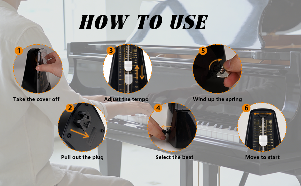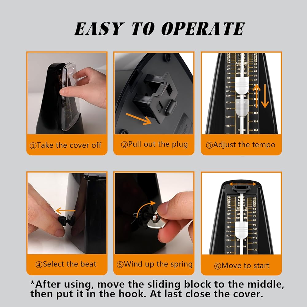 SIMPLE OPERATION: Remove the dust cover before using the metronome, then pull out the bottom slot. Slide the slider to adjust the speed, select the desired tempo, wind the mainspring clockwise, and finally remove the pendulum hook to begin operation