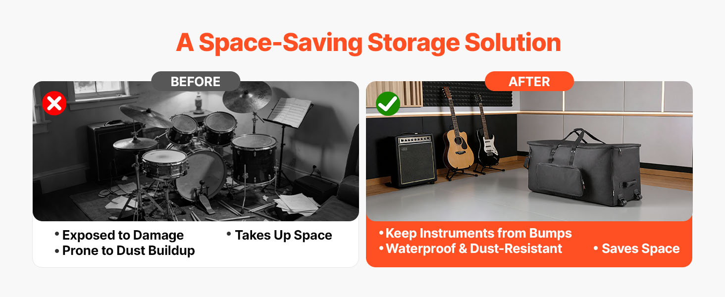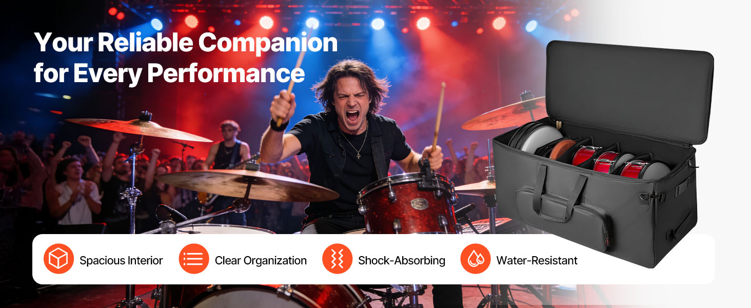 Long-Lasting Reliability: The case for electric drums is designed with reinforced stitching to enhance seam strength for long-term use. The durable zipper keeps your gear secure and resists splitting or slippage, even under heavy pulling