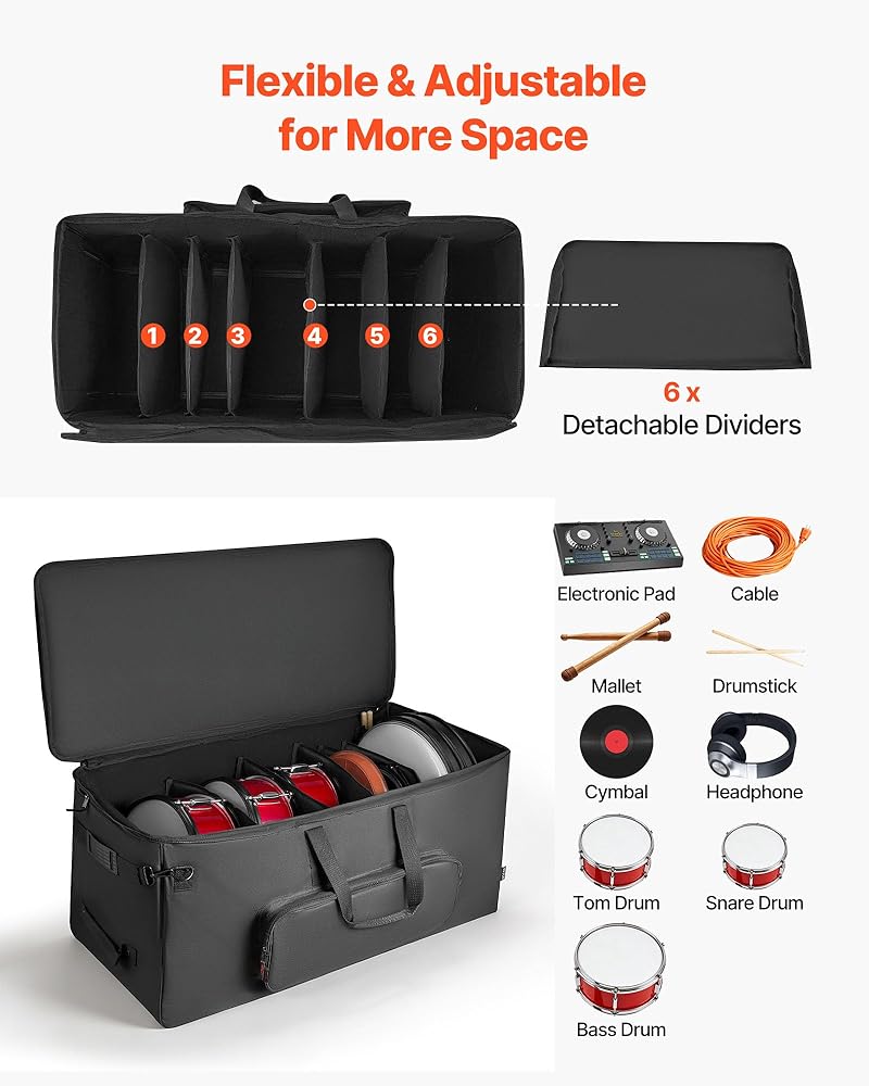 Spacious Space: This electronic drum kit bag features an interior size of 36.2 x 16.5 x 16.1 in with six detachable dividers. It provides protection for your equipment (snare, toms, bass drums, cymbals, etc.), making your travel more organized
