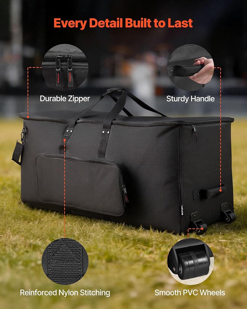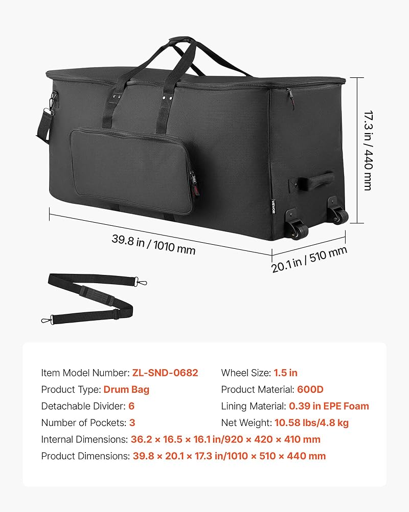 VEVOR Electronic Drum Kit Bag, 600D, Padded Drum Bag with Wheels, Large 36.2 x 16.5 x 16.1 in Interior, Lightweight Travel Case with Detachable Dividers, Multiple Pockets, for Electric Drums, Black