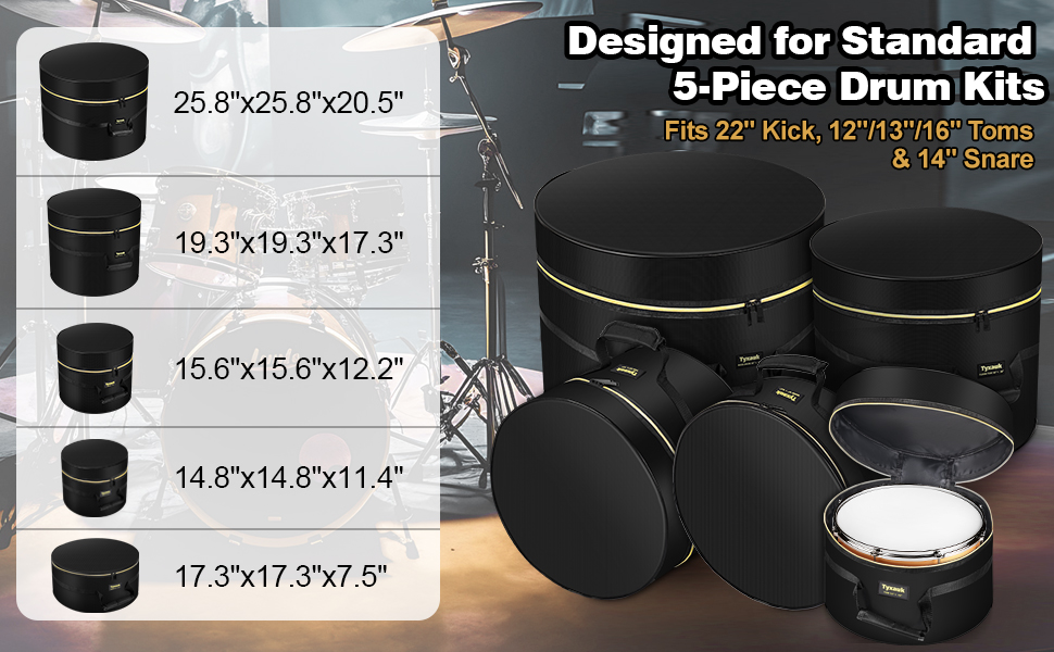 5-Piece Drum Case Set - Padded Drum Bags for 22" Kick, 12"/13"/16" Toms & 14" Snare Lightweight drum carrying cases for drummers, ideal for gig transport & long-term storage, protects standard kit