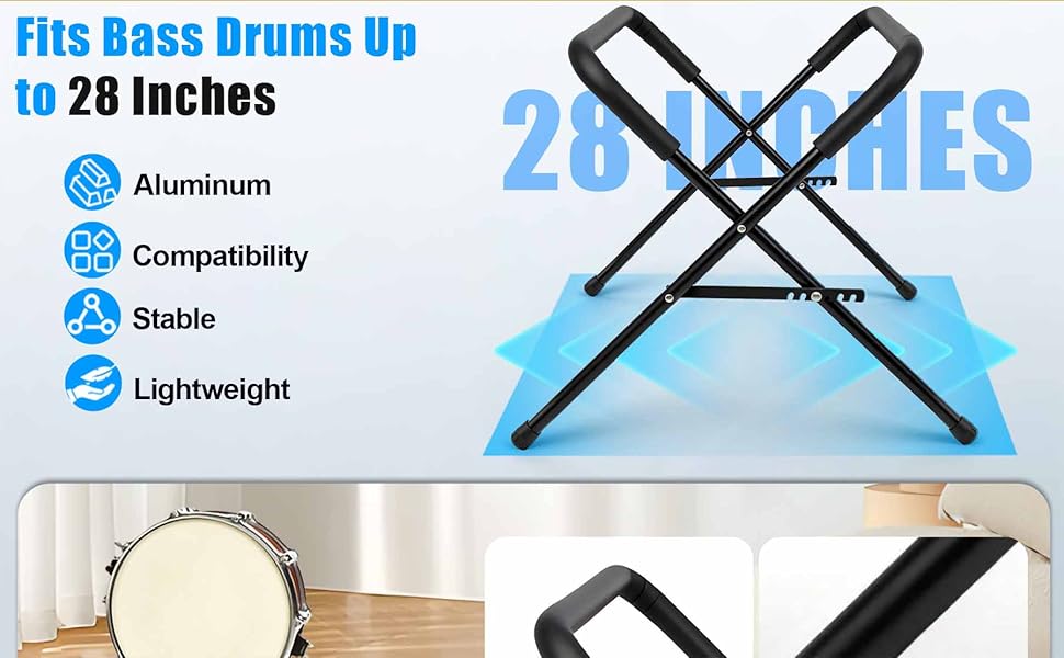 Adjustable Multi-Fit Folding Bass Drum Stand – Features 12–18.55 inch width and 15.5–23.55 inch height adjustment with heavy-duty 21-inch steel bass drum legs rack, perfectly accommodating large drums up to 28 inches for band and orchestral performances.