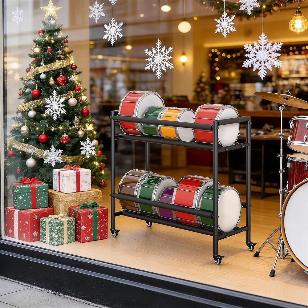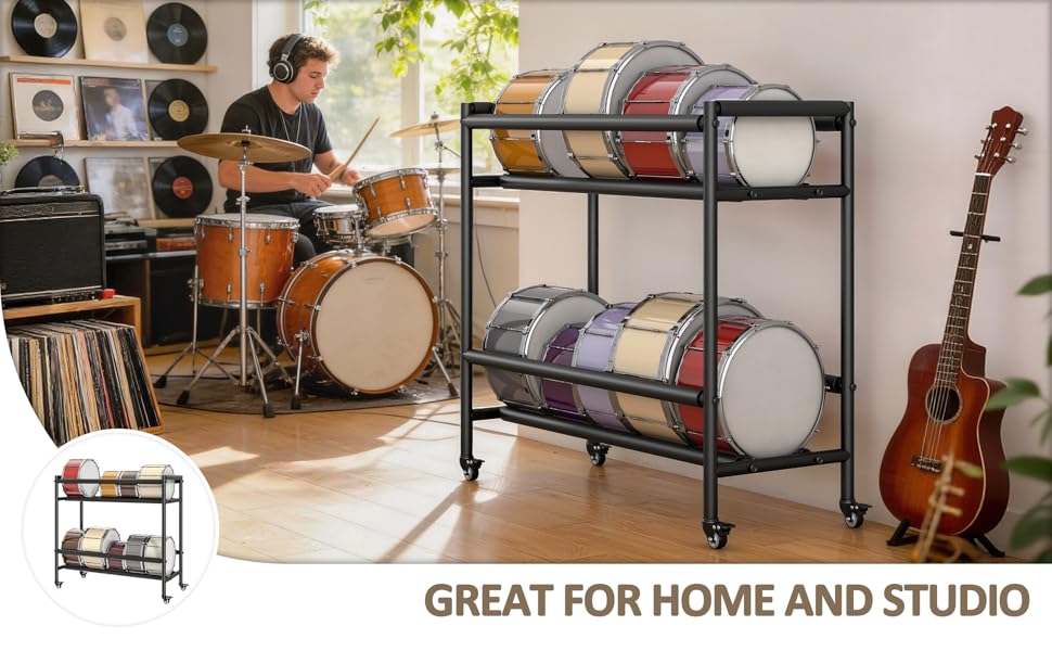 DISPLAY & STORAGE: This snare stand features a dual-tier design, with each level capable of holding multiple snare drums. Keep your cherished instruments neatly organized and showcase your collection with pride. Suitable for drummers of all levels—beginners, students, professionals, or anyone with drumming experience. Provides stable support for home use, recording studios, stage, or any venue