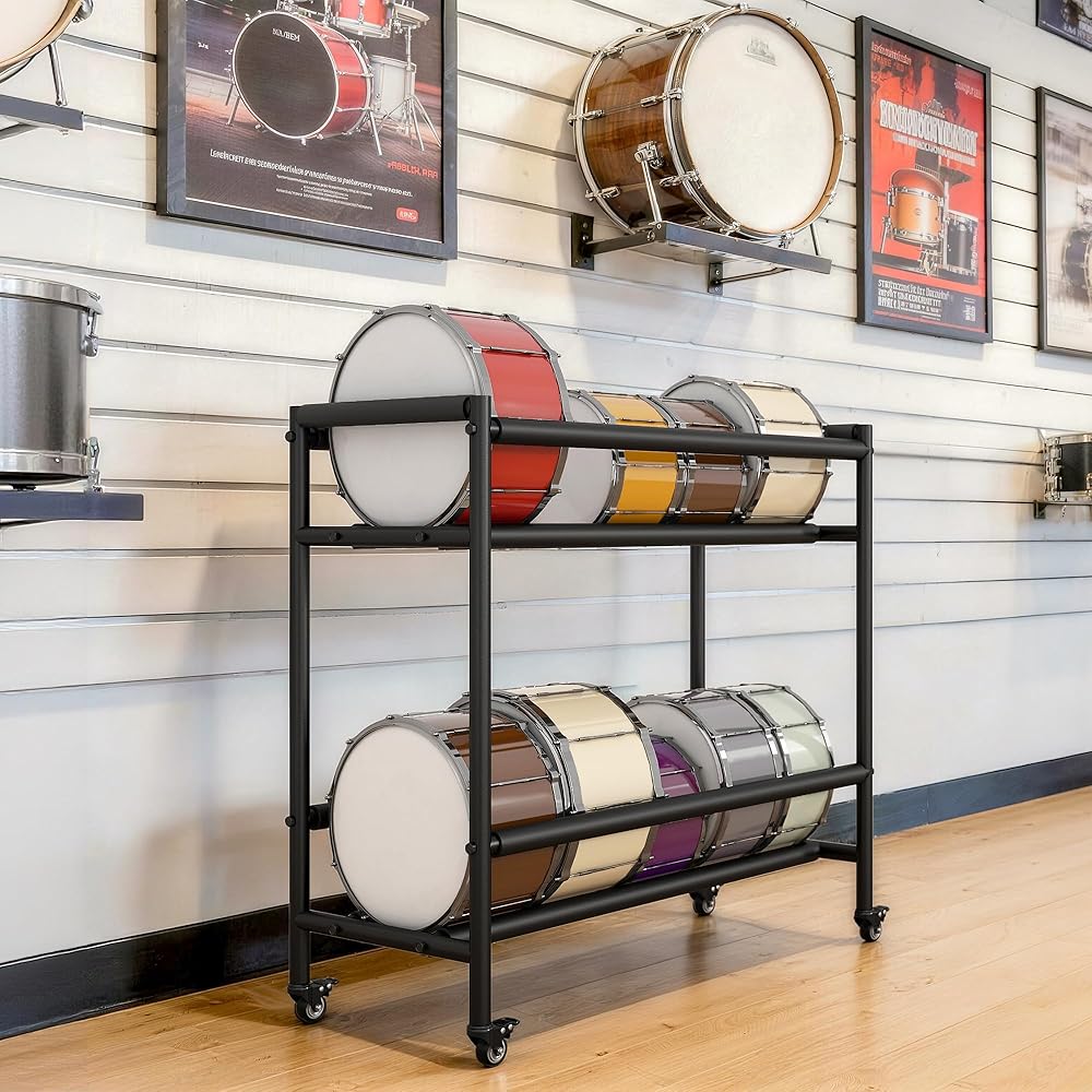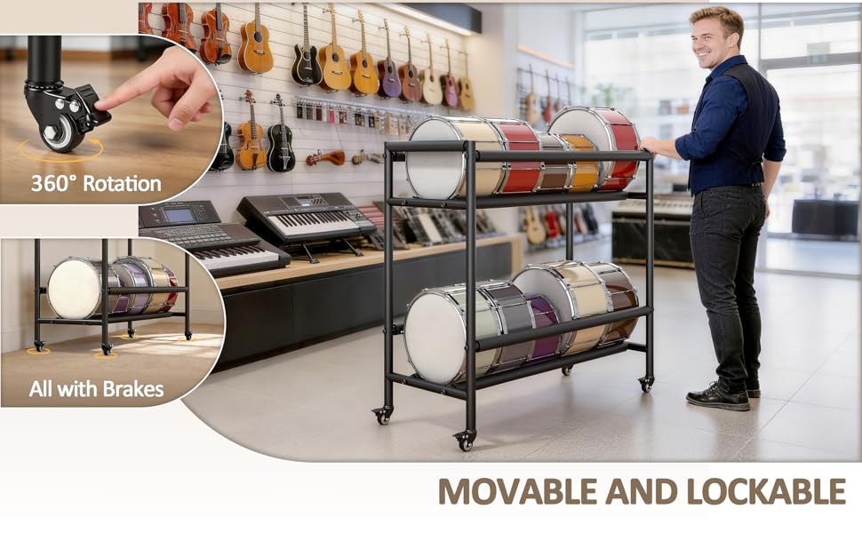 ROLLING & LOCKABLE: The snare rack cart features four lockable, premium 360° rotationl casters for effortless movement to your desired location, allowing convenient storage and retrieval of your snare drum. The locking mechanism ensures the cart remains securely in place when stability is required