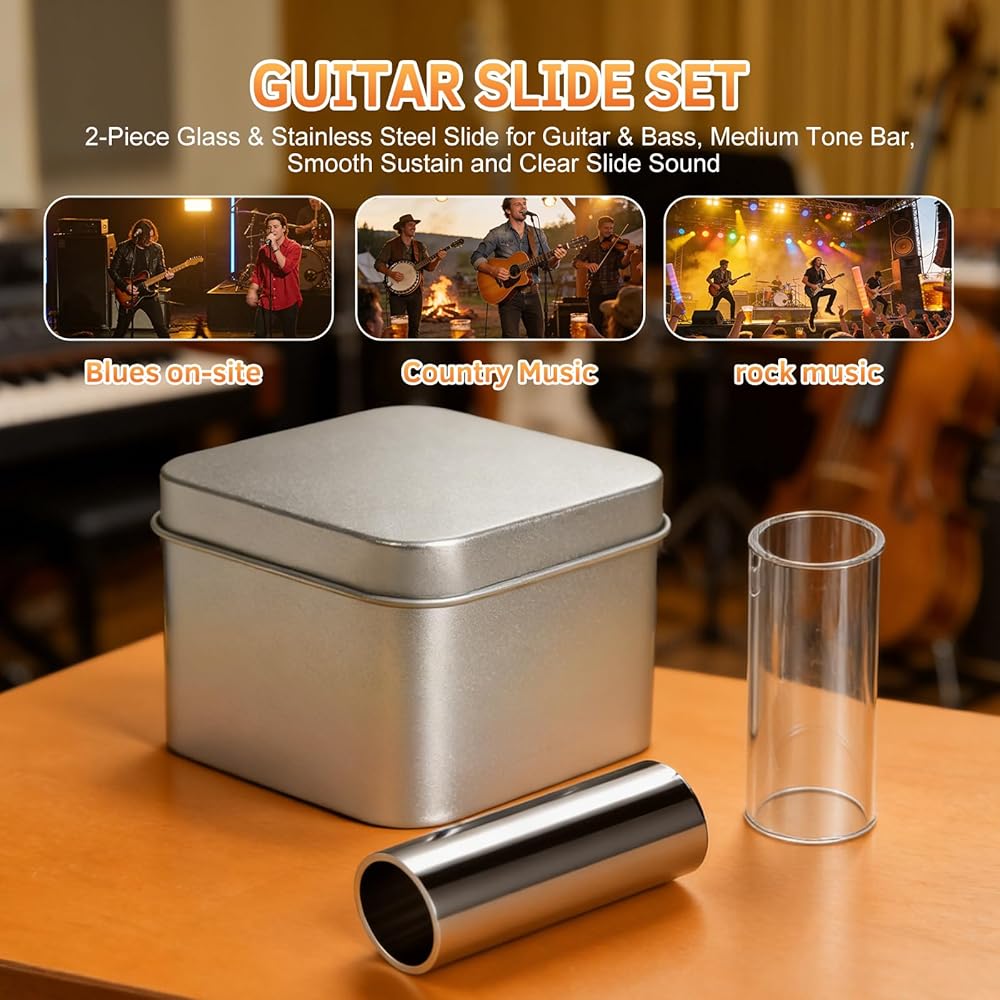 Two Essential Slide Styles : Includes both a smooth glass slide and a durable stainless steel slide for versatile playing tones and performance options.