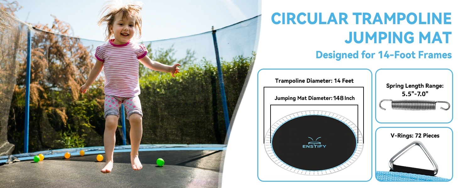 ✅ 【PERFECT FIT FOR 14FT TRAMPOLINES】Precisely engineered for 147 jumping area diameter with 72 V-rings & 5.5"-7.0" springs (Excluding Springs and Frame). Avoid mismatched mats - our strict 14ft sizing guarantees safe bouncing. Ideal for families replacing worn-out backyard trampolines