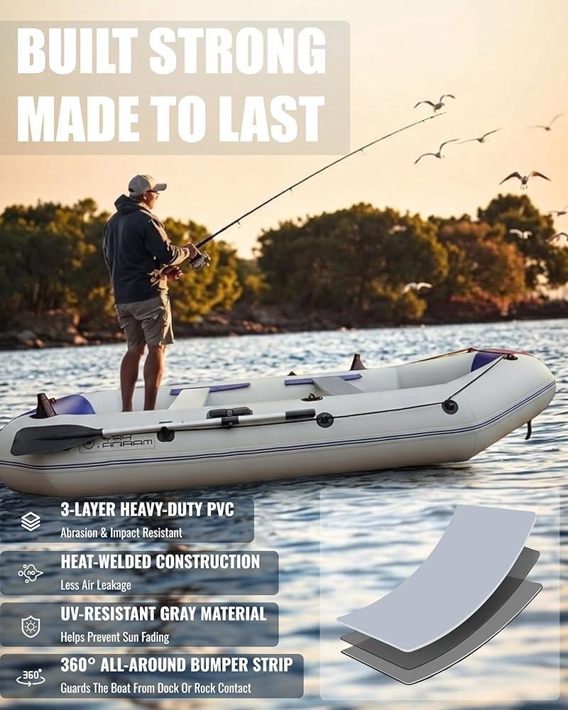 HEAVY-DUTY INFLATABLE FISHING BOAT FOR ADULTS: Made with reinforced 3-layer PVC and wrapped with a full anti-collision rubbing strake, this inflatable boat is highly resistant to abrasion, punctures, and impact, making it ideal for lakes, rivers, and nearshore fishing.