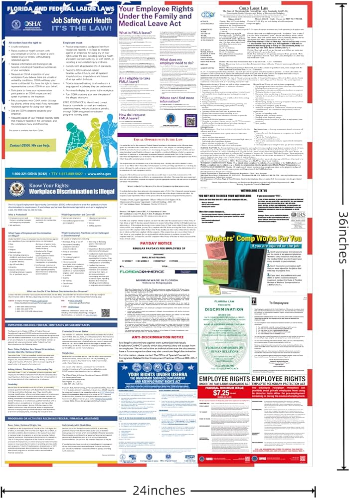 All-in-One Compliance: This poster includes all the necessary labor law information mandated by Florida and federal regulations. It covers essential topics such as minimum wage, health and safety regulations, employee rights, and workplace safety compliance, ensuring you meet all legal requirements.