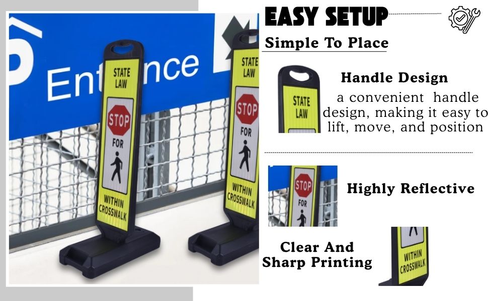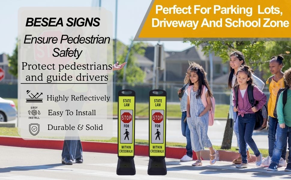 BESEA 2‑Pack 44″ Reflective Crosswalk Safety Sign – Printed with “STATE LAW STOP FOR WALKER WITHIN CROSSWALK", Water‑Fillable Weighted Base for Pedestrian Traffic & Parking Lot Safety