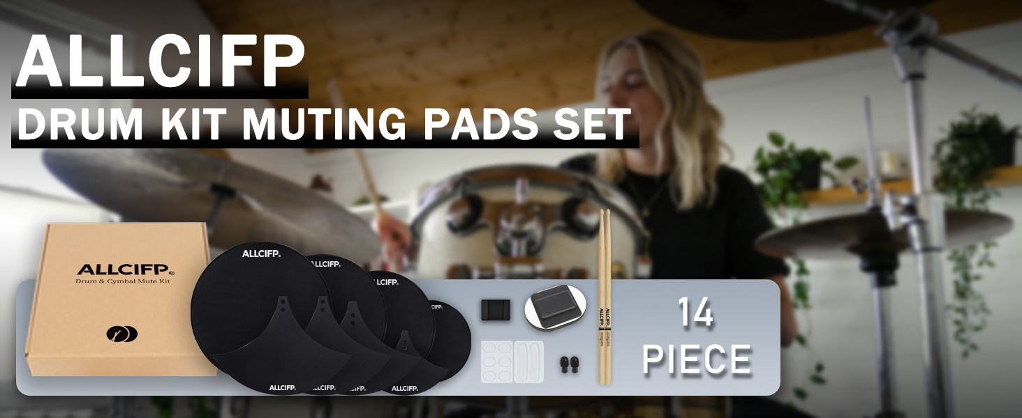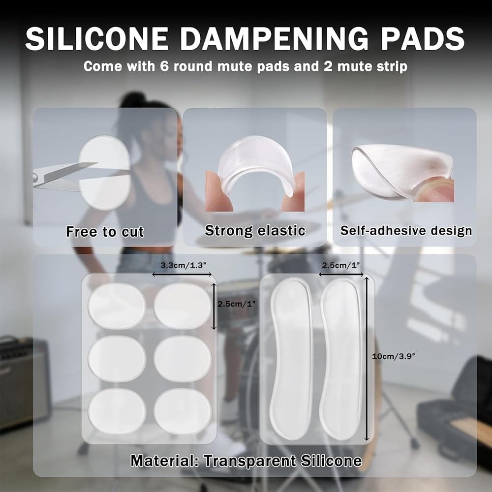 [14 Piece Drum Kit Mute Pads]: This mute pad set includes 4 tom or snare pads, 4 cymbal pads, 1 bass drum pad, 1 snare wire pad, 1 pair of drumsticks with stick dampeners, 6 round dampening gels(silicone), and 2 long gels(silicone).
