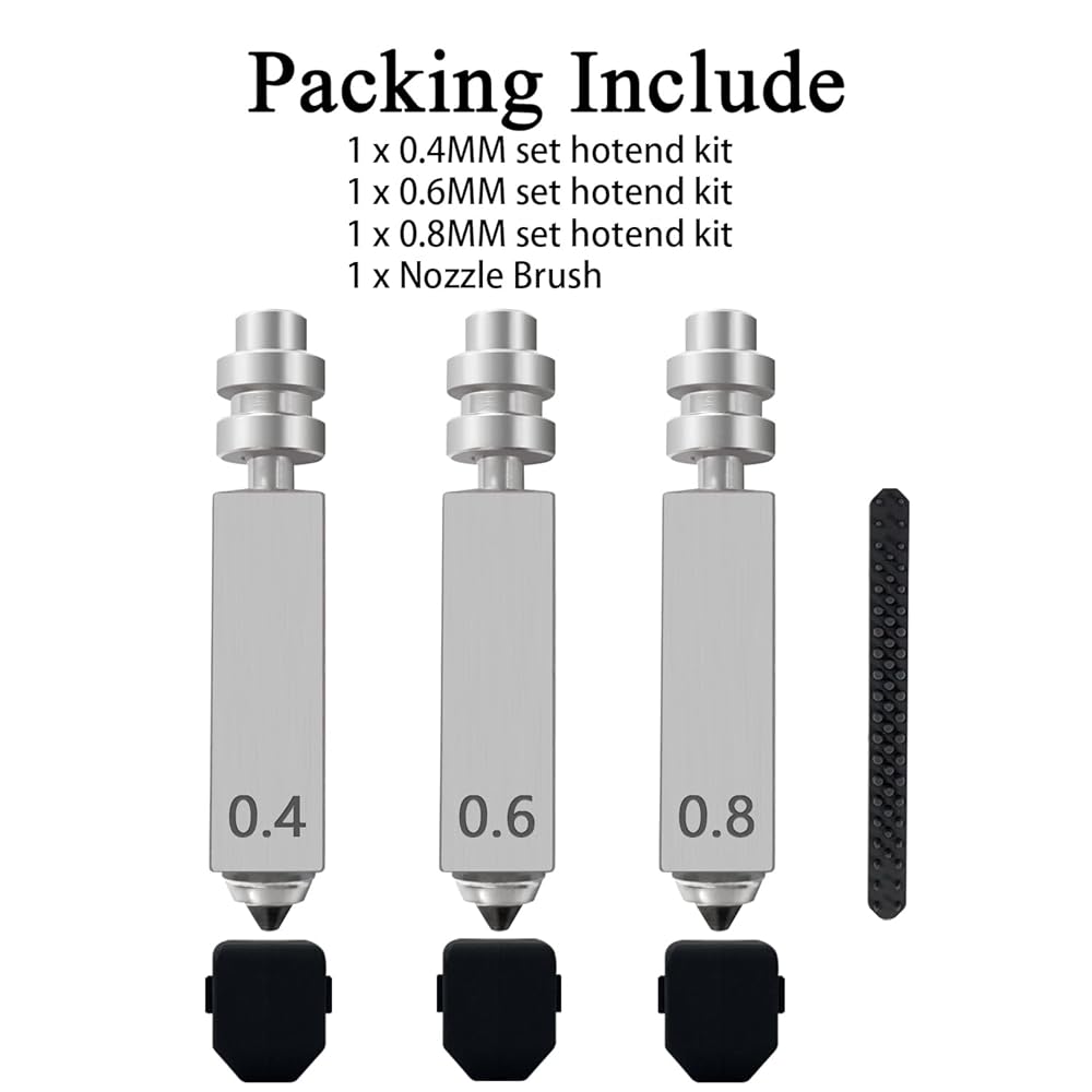 Package Included: 1PK 0.4MM Nozzle + 1PK 0.6MM Nozzle + 1PK 0.8MM Nozzle + 3PK Silicone Cover + 1PK Nozzle Brush.