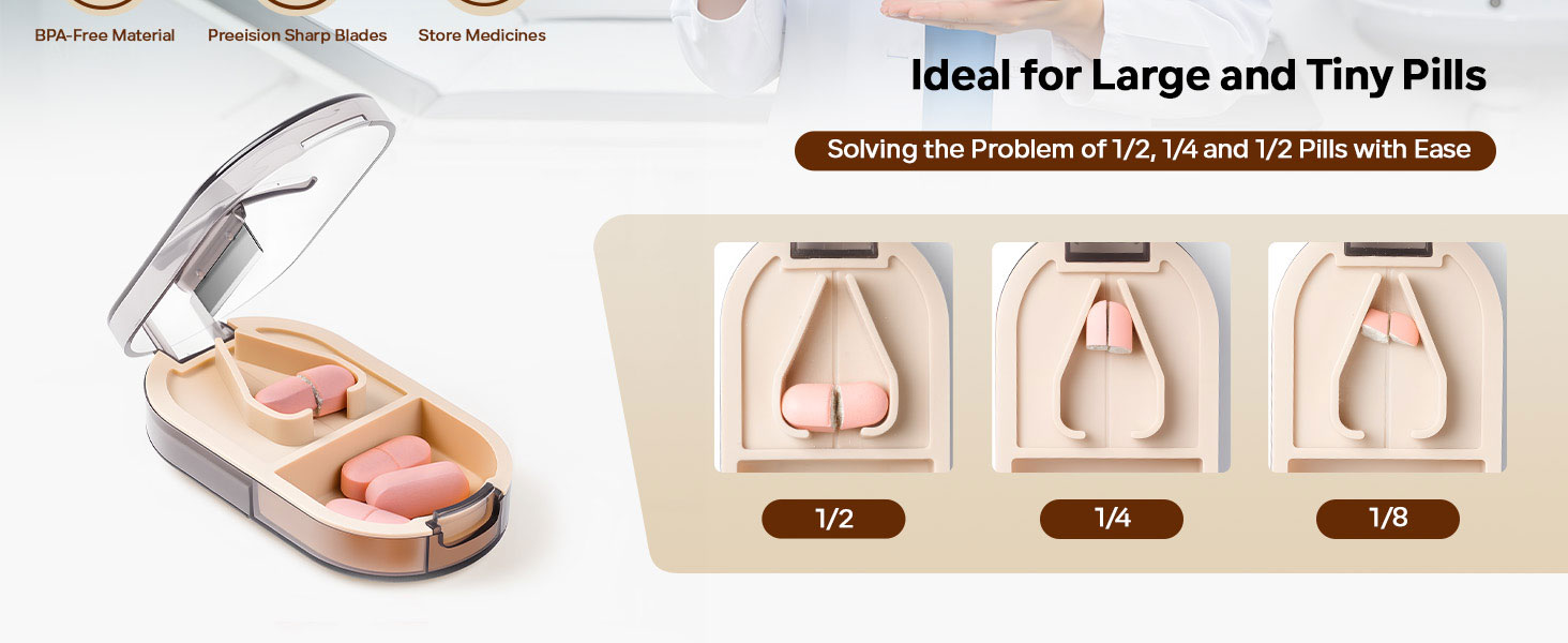 CUT TO THE SIZE YOU NEED: Easily split pills into halves, then smaller portions such as 1/4 or 1/8 with repeated cutting, making tablets easier to swallow and more convenient for daily use.