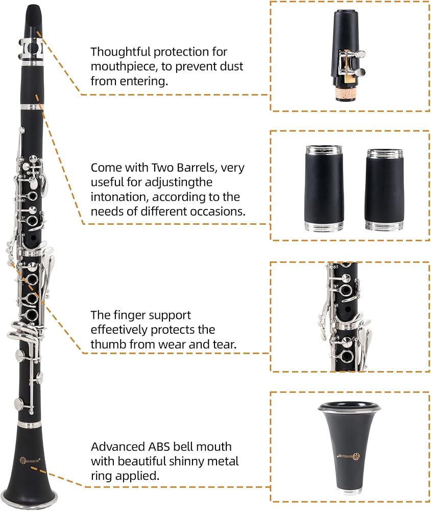✔️【Excellent Craftsmanship】The clarinete tube is digitally mechanically perforated to improve the stability of intonation. The junction of the pipe mouth is finely polished and closely connected after assembly. Piston structure design is reasonable and easy to play.