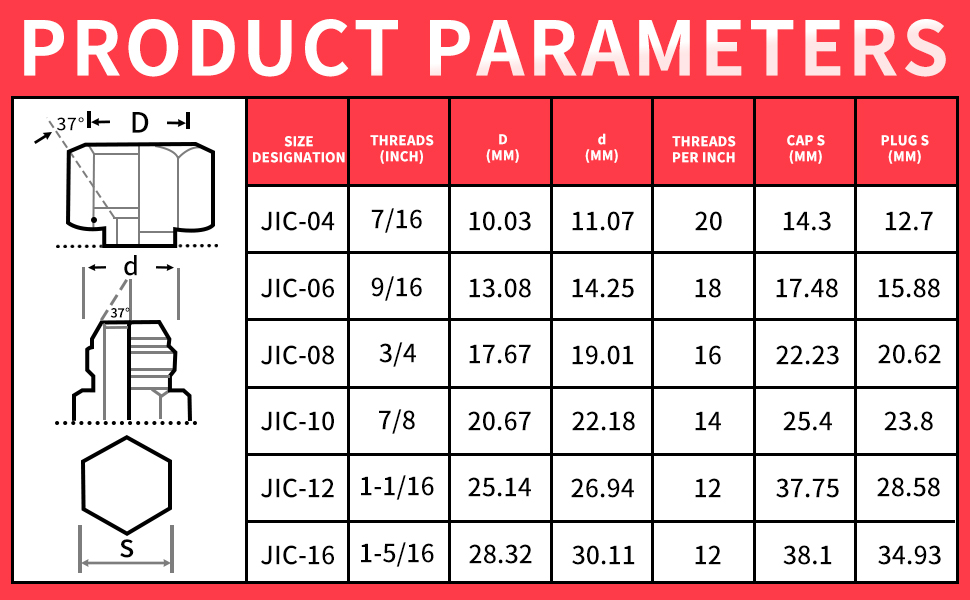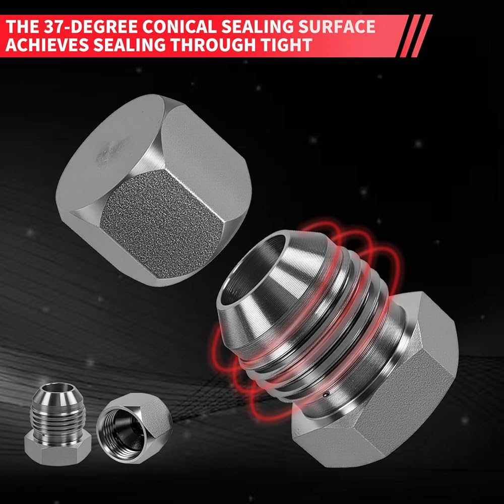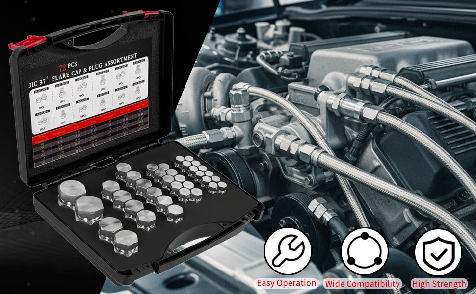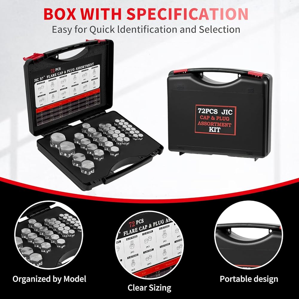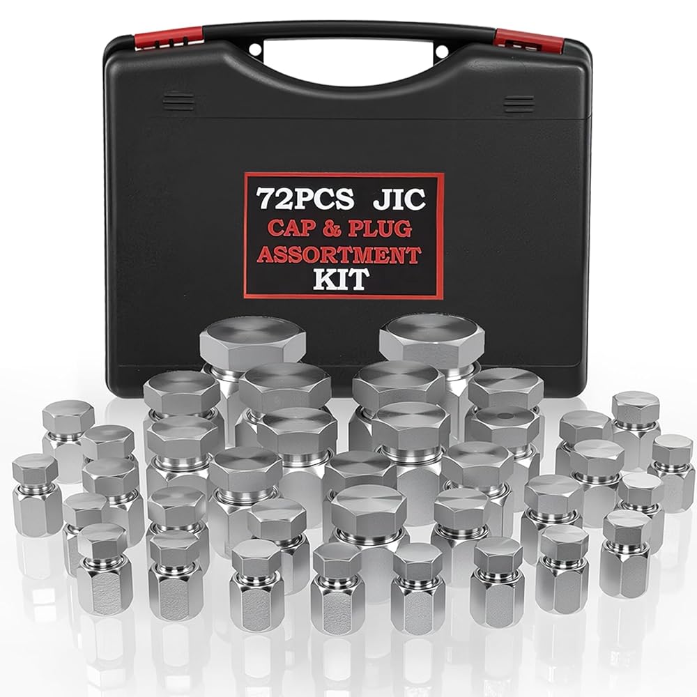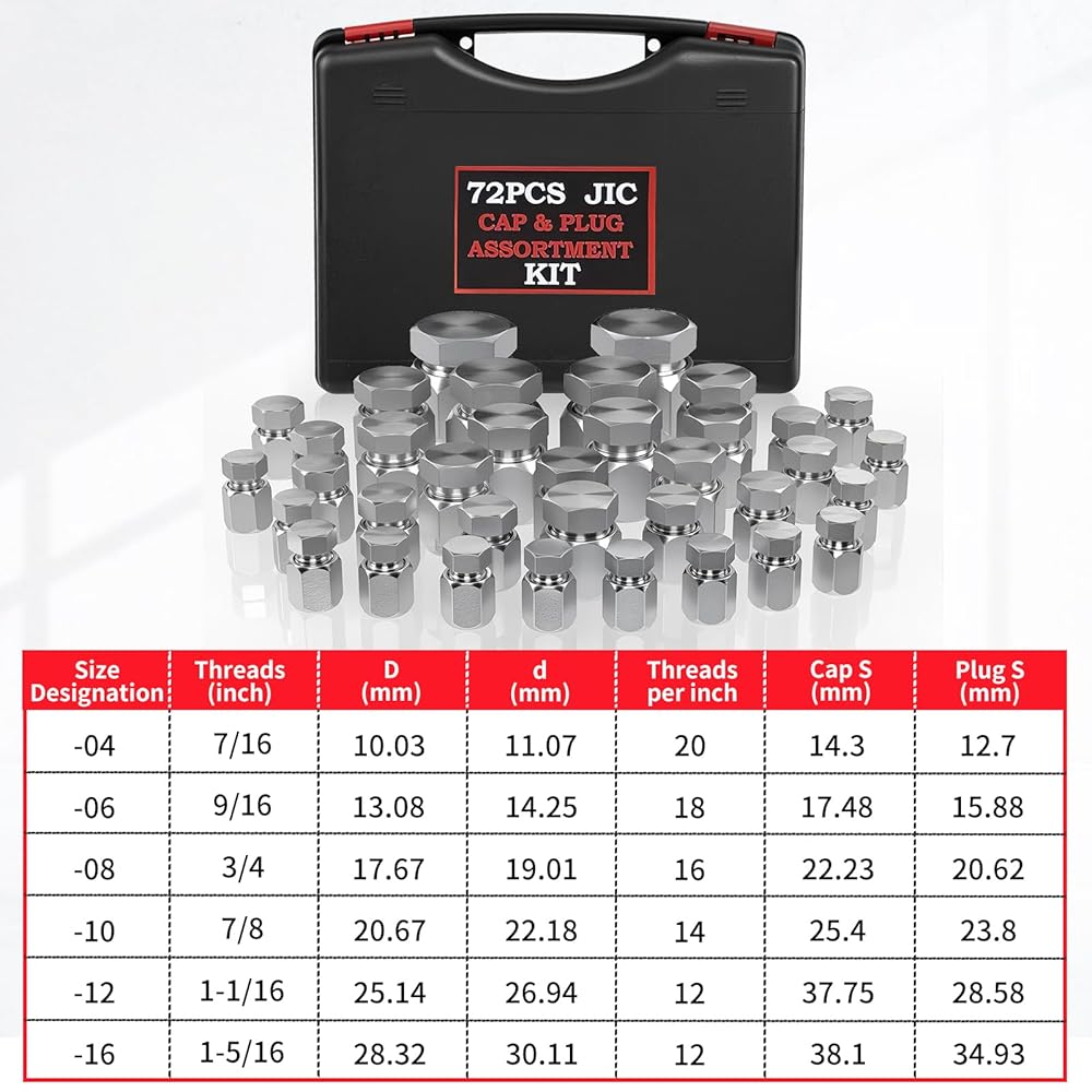 PAKAGE INCLUDE: This 72pcs JIC cap and plug set includes sizes 04 (12pcs), 06 (10pcs), 08 (6pcs), 10 (4pcs), 12 (2pcs), and 16 (2pcs), making it perfectly suited for a variety of hydraulic tasks and an essential addition to your toolkit