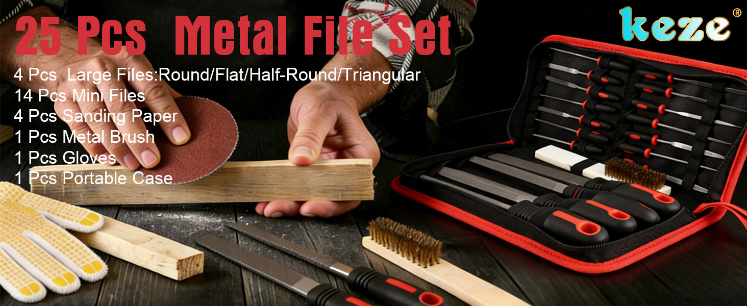 Keze 25 Pcs Metal File Set,Premium T12 Carbon Steel Flat/Half-Round/Round/Triangle Large Files,14 Pcs Needle Files with Case,4 Pcs Sandpaper,Brush,and A Pair of Gloves,for Woodworking.