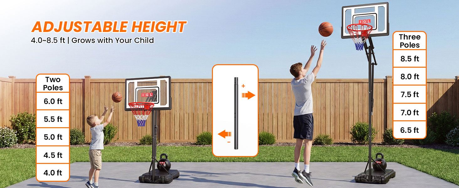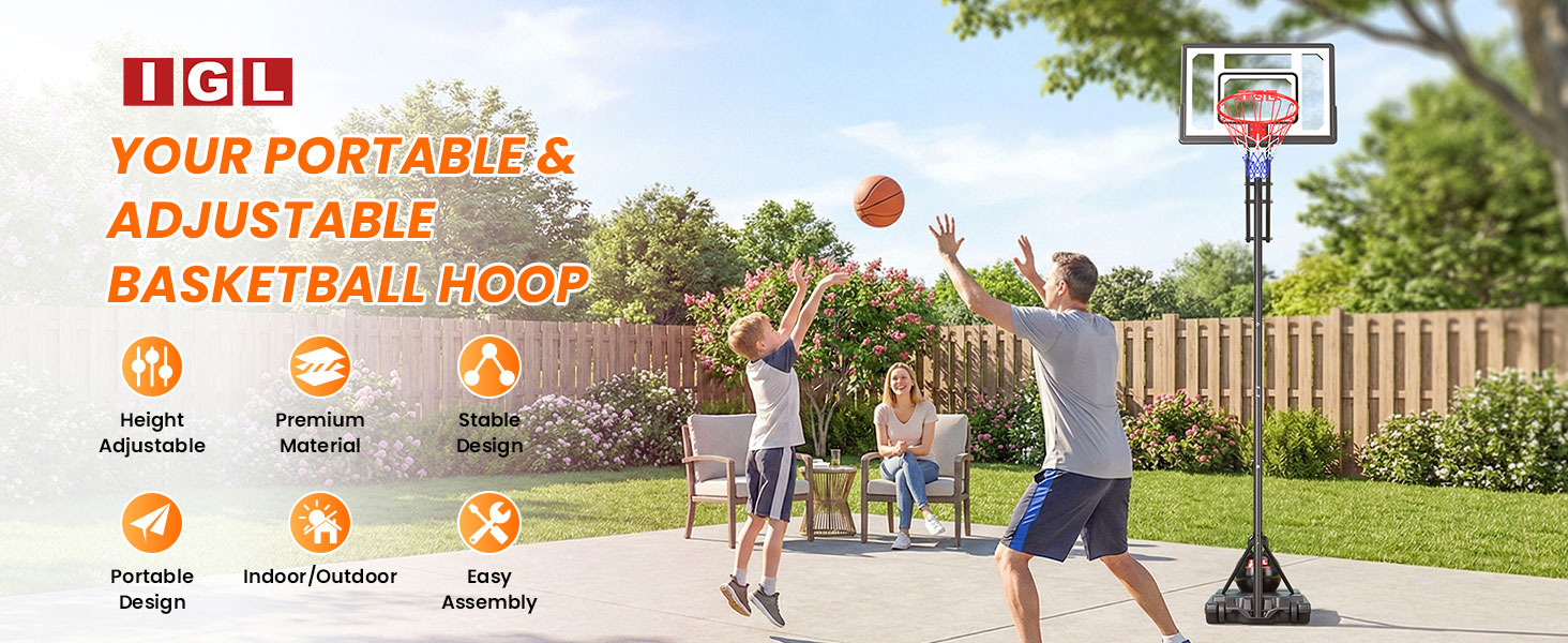 Give your young athlete the gift of endless fun with the IGL Kids Basketball Hoop—a portable, adjustable system built to grow with your family. Whether it's a weekend game in the driveway, after-school practice in the backyard, or indoor play on a rainy day, this hoop brings the excitement of basketball to kids, teens, and youth of all skill levels. Designed to Fit Every Age and Stage Say goodbye to buying new hoops as your child grows. With tool-free height adjustment from 4 to 8.5 feet, the rim rises right along with them. Young beginners can start low to build confidence and proper form, while older kids and teens can raise it for slam dunks and competitive play. It's one hoop that lasts for years—through every growth spurt and skill milestone. Built for Real Play, Rain or Shine Kids play hard—and this hoop is ready for it. The 33-inch shatterproof polycarbonate backboard delivers a crisp, professional rebound feel while standing up to aggressive shots, dunks, and daily use. Paired with a rust-resistant RECC steel frame, it's engineered to withstand sun, rain, and changing seasons without fading or warping. Whether left in the backyard or moved around, it stays game-ready year after year. Stability You Can Trust Safety comes first, especially when kids are running, jumping, and competing. That's why the IGL hoop features a dual-ballast system for rock-solid stability. Fill the main base with 55 lbs of water or 71.6 lbs of sand, then add another 30 lbs of water or 40 lbs of sand to the included extra anchor. Together, they prevent tipping and reduce wobble during even the most intense games—giving parents peace of mind and kids a safe place to play. Portable Fun That Goes Where They Go Basketball shouldn't be tied to one spot. With built-in smooth-roll wheels, this hoop moves as freely as your family does. Roll it from the garage to the driveway for a sunny afternoon game, tuck it away in the shed after practice, or bring it indoors for winter fun. No heavy lifting, no complicated disassembly—just grab and go. Setup So Simple, You'll Be Playing in No Time We know you're busy, so we made assembly straightforward. Every part is clearly labeled, and a step-by-step video guide walks you through the process. No special tools are needed, and most setups are completed in minutes. And if you ever have a question, our friendly support team is just one message away—ready to help so your family can focus on what matters most: having fun together. Bring home the IGL Kids Basketball Hoop today—where every shot, every game, and every memory starts here.