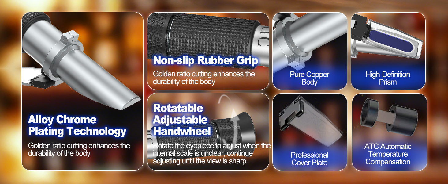 Dual-Scale + ATC, No Tedious Conversions:Built-in dual scales (1.000-1.130 SG/specific gravity tester & 0-32% Brix) for this handheld Brix refractometer with ATC, supporting Brix readings. No manual conversion—2-3 drops of sample for simultaneous accurate results, ideal for wine/beer brewing wort fermentation monitoring. 10°C-30°C ATC eliminates manual temperature calibration, ensuring stable readings for lab or outdoor use