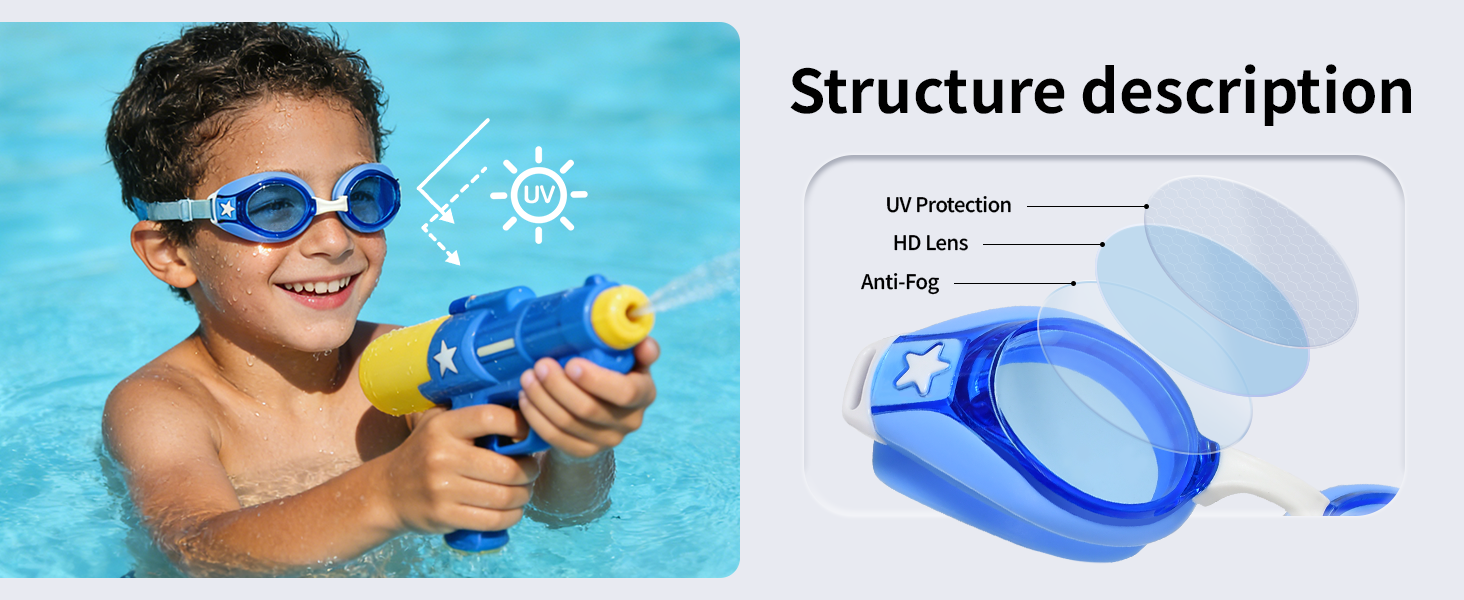 Anti-fog & UV Protection - Child-safe lenses resist shattering/scratching. Outer UV layer reduces sun glare; inner anti-fog coating maintains clear vision. Our Kids Swim Goggles are tested for chlorine/sea water durability.