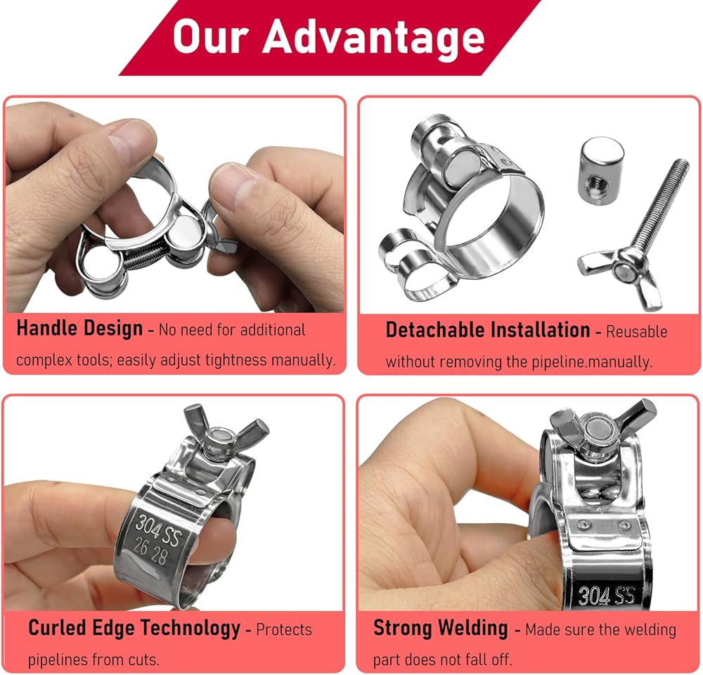 [Curled Edge: Protect Pipes Safely] The hose clamp edge is finely curled, avoiding pipe cuts from traditional sharp edges. Fits tightly to pipes during long-term use, preventing damage and leakage caused by vibration and friction, protecting hoses and pipes comprehensively.