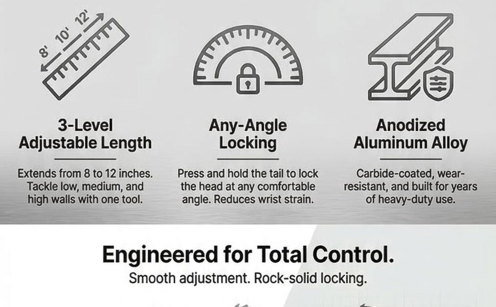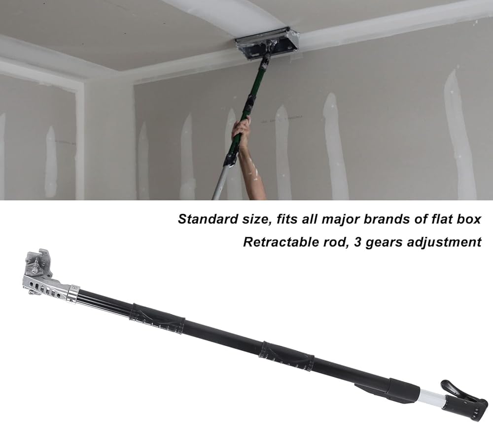 【3-Level Extension Handle | Versatile Reach】Press the mid-shaft lock to extend the handle to three different lengths, easily adapting to walls of various heights. From 8 to 12 feet, you can maintain a comfortable stance while reaching high areas, making this retractable box handle an incredibly versatile plastering tool for both ceilings and upper wall sections.