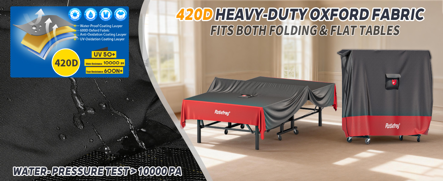 【Waterproof & UV-Resistant】The pingpong table cover is made of 600D PU-coated Oxford fabric double-stitched offers tear resistance, and waterproofing. Withstands prolonged exposure to rain, snow, and UV rays,empowering your outdoor adventures.