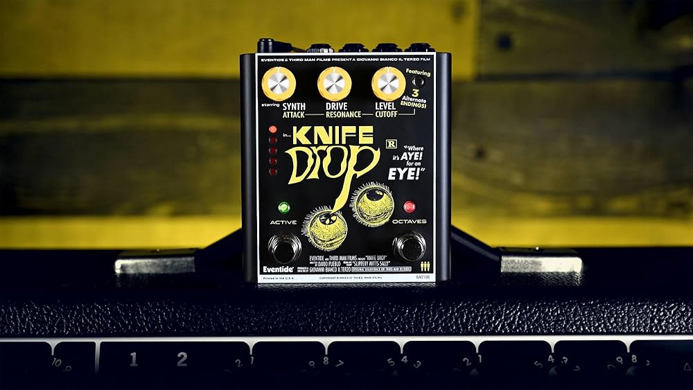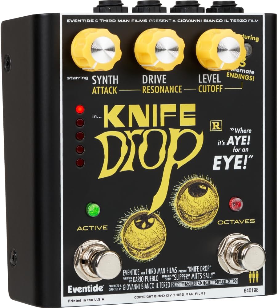 Infinite Ear-piercing Excitement Create your own twisted guitar tones with Eventide's Knife Drop! This zany collaboration between Eventide and Jack White's Third Man Hardware blends an over-the-top distortion and fuzz circuit with octave and synth effects and features six presets created by Jack himself. Dial in the monophonic synth to reach mind-altering wackiness, then hit the octave mode switch with single and suboctave choices to lay down the most psychedelic funk imaginable. Additional controls include Attack, Resonance, and Cutoff to fine-tune the synth and a switch to move the synth sound either before or after the fuzz circuit, further adding to the overall tweakability of this raucous pedal. Sweetwater's guitar players are in awe of the near-infinite possibilities of ghoulish yet engaging sonic options in a single pedal. The Knife Drop is ready to accept external switches like Eventide's OXU series and control single parameters with an additional expression pedal.
