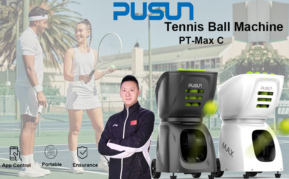 Professional&Portable: Intelligent tennis ball machine with dual-control via"PUSUN Tennis"App and remoter, PT-Max C can be worked with both tennis and padel tennis. Designed with moveble wheels and strectable handle, it is easy to transport and store the machine.