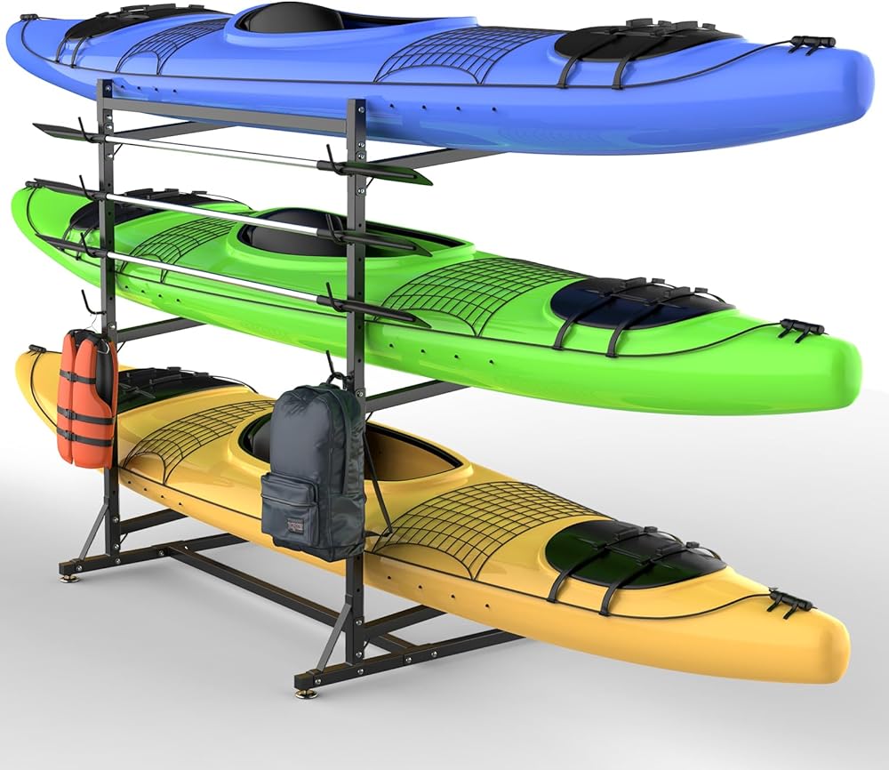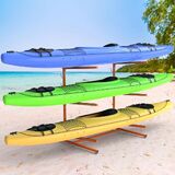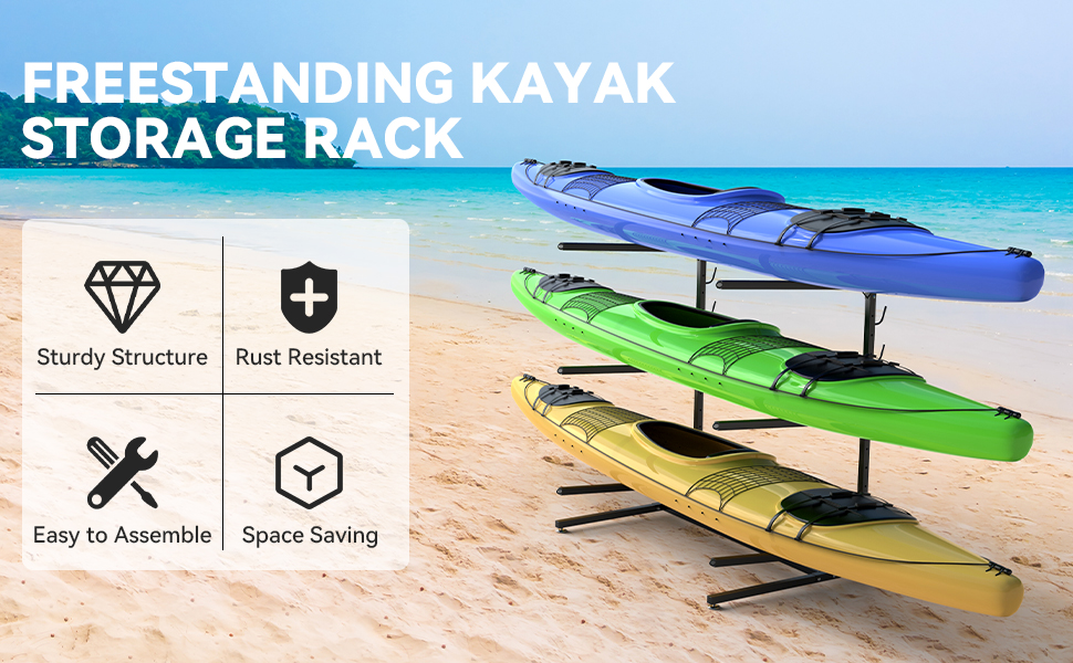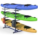 Save Space: Our freestanding kayak rack can hold up to 3 kayaks, canoes, paddleboards, and surfboards to keep your storage area organized, you can place them in garages, sheds, barns, docks and backyards.