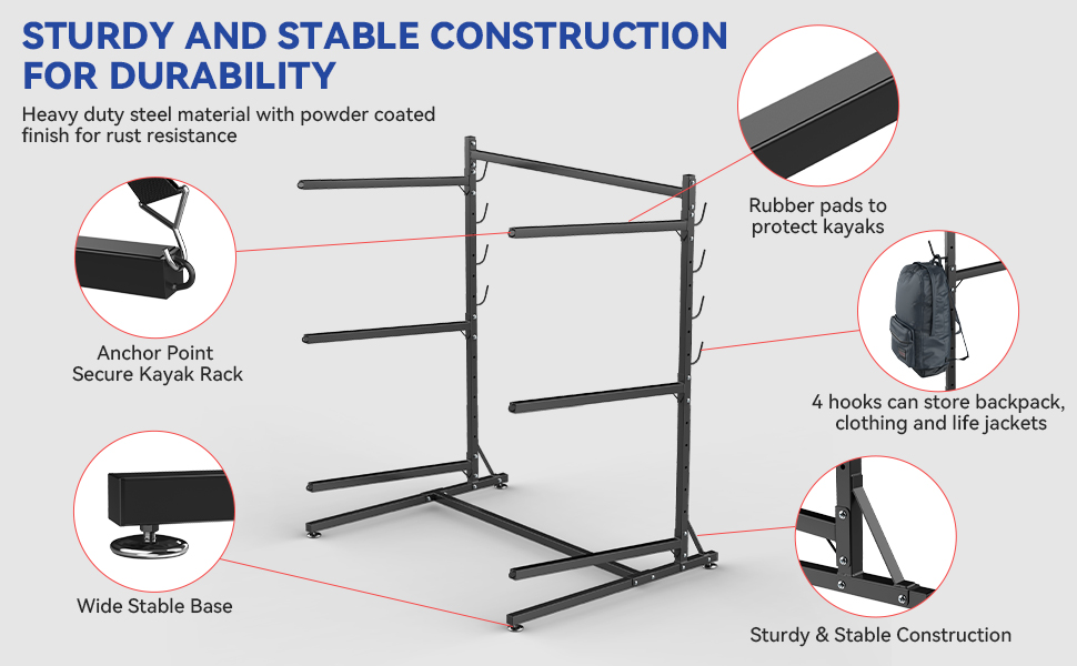 Stable Support: Triangular supports at the bottom of each tier's arms and triangular hooks at the top help you secure your kayak to the rack with ropes. The kayak holder features an extended base for added stability.