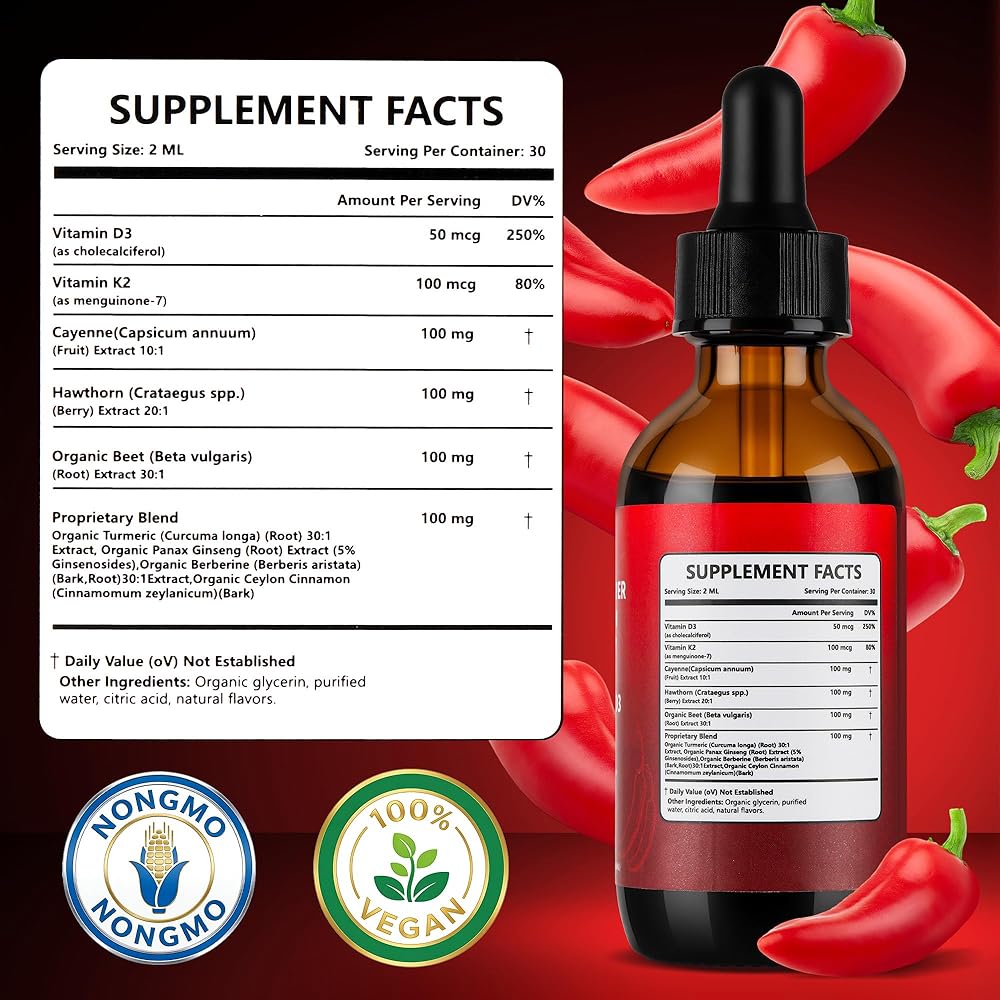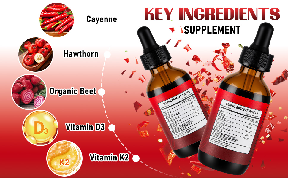 Ingredients including cayenne pepper, hawthorn, beet root,turmeric,plus essential vitamins K2 and D3.