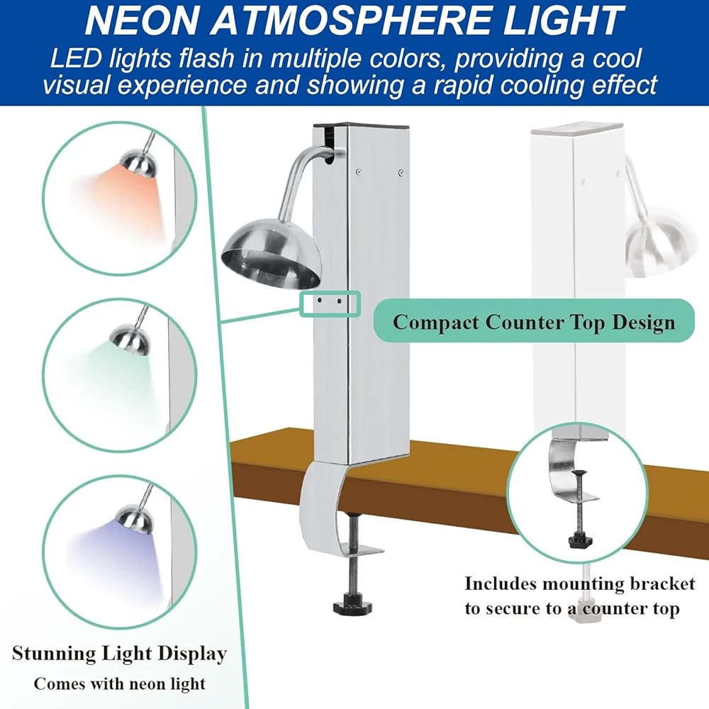 The compact countertop design includes a mounting bracket to fix to the countertop, such as a bar or tabletop, saving valuable space; the colorful neon design adds to the atmosphere of the working environment, and the multi-color LED lights flash, allowing you and your customers to visually experience the cooling effect.