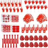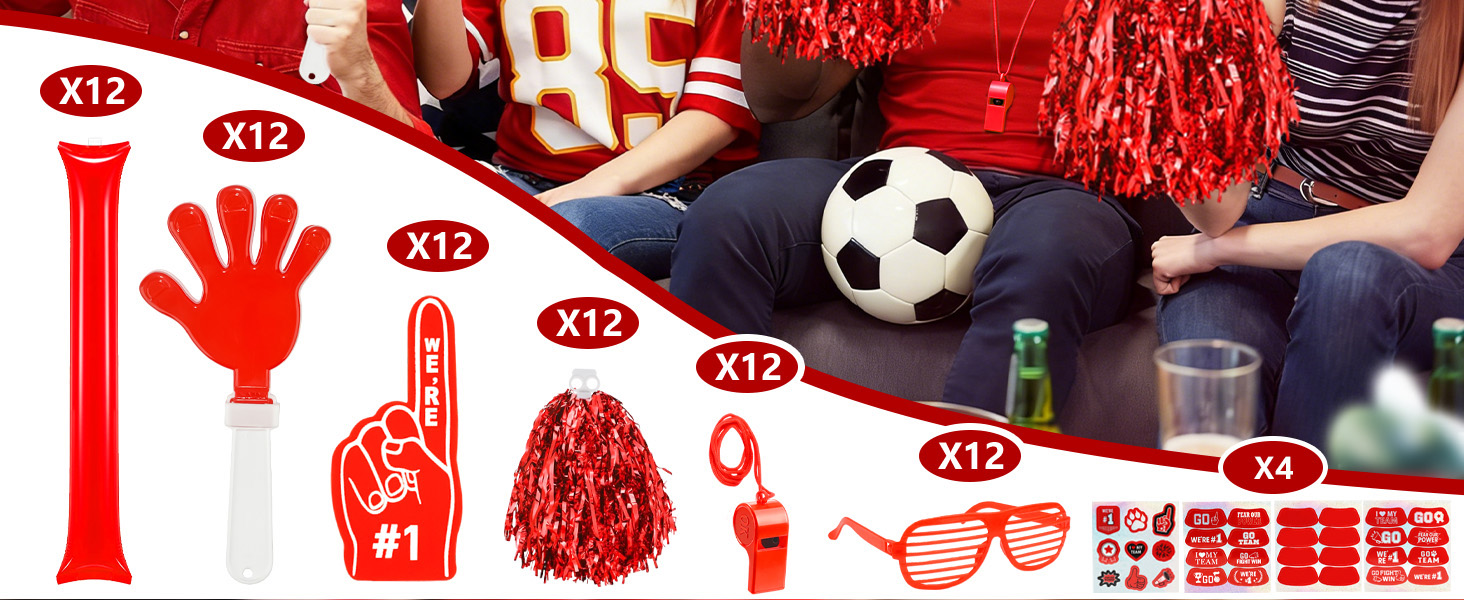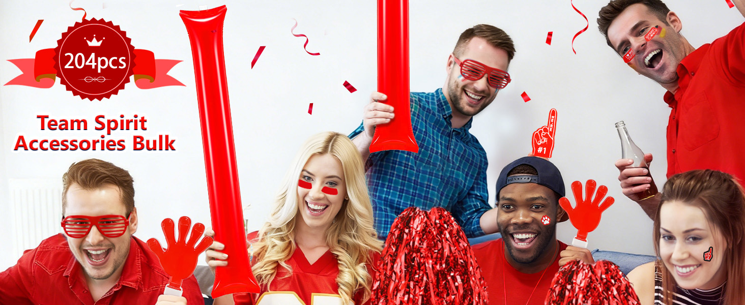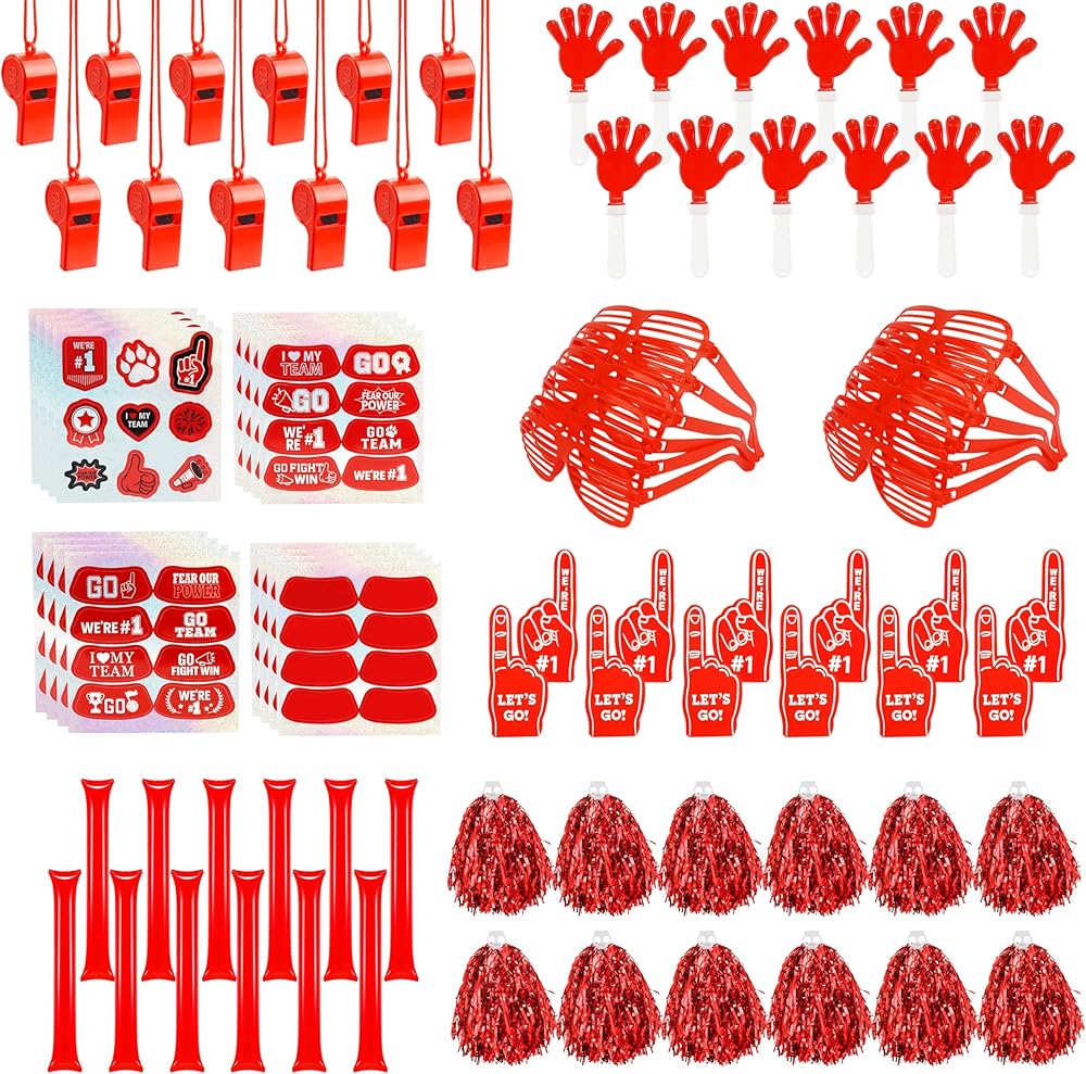 ALL-IN-ONE RED SPIRIT SET – 204 PCS Total: 12 cheer pom poms, 12 hand clappers, 12 thunder sticks, 12 whistles with lanyards, 12 shutter glasses, 12 EVA foam cheering fingers, plus 16 sports-themed sticker sheets (132 stickers in total). This complete bulk team spirit accessories kit outfits the whole section—no need to mix and match. Everything arrives in coordinated red, making it the go-to red spirit day accessories for schools and leagues.