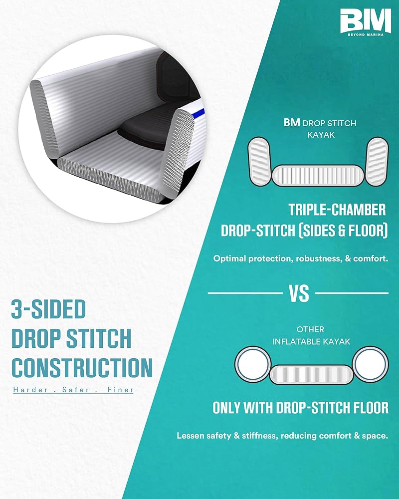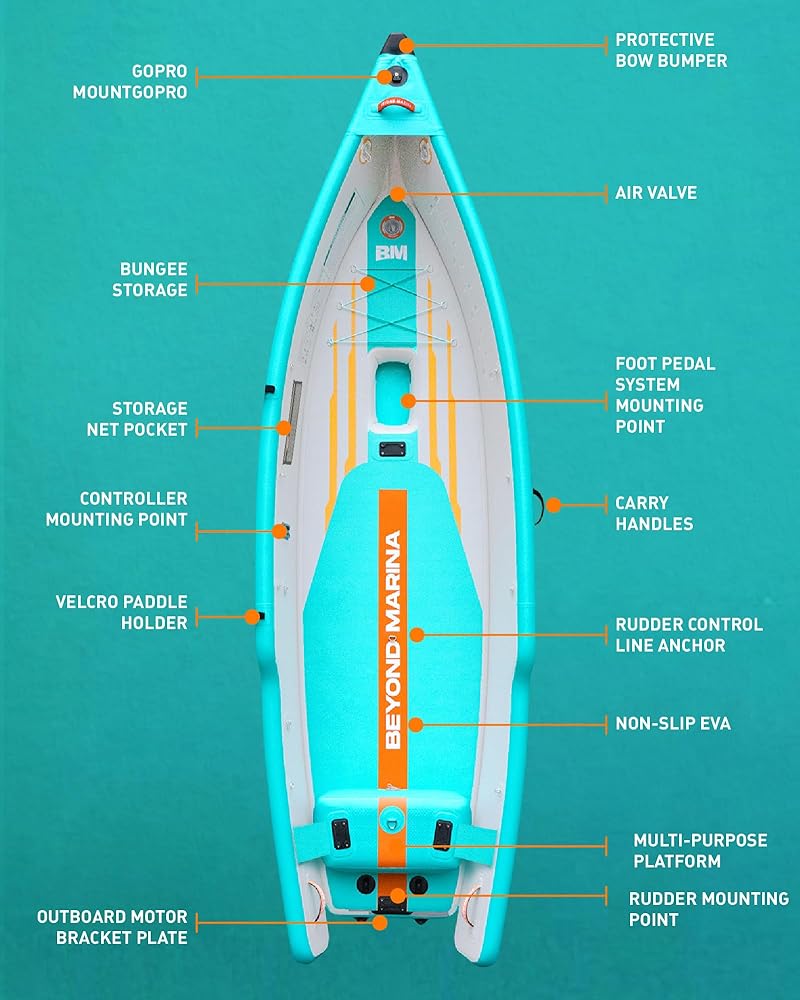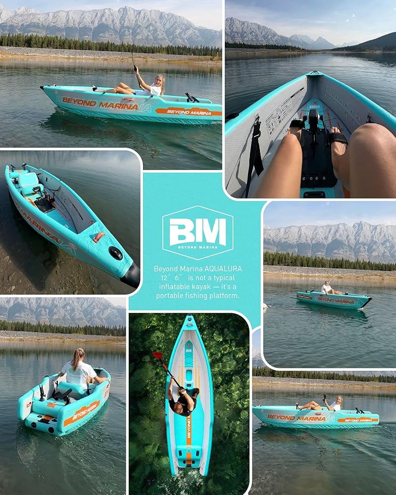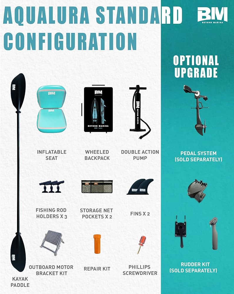 A Portable Fishing & Recreation Platform Built to Evolve The Beyond Marina 12′6″ Inflatable Kayak is designed for anglers and outdoor explorers who want maximum freedom on the water without the hassle of a hard-shell boat. Combining excellent stability, generous deck space, and true portability, this kayak performs equally well for fishing, cruising, or casual recreation on lakes, rivers, and calm coastal waters. With its optimized 12′6″ hull length and wide profile, the kayak offers smooth tracking and confident balance — giving you a solid platform for casting, relaxing, or carrying your gear with ease. Ready-to-Go Out of the Box This kayak comes fully equipped for immediate adventure, including a comfortable inflatable seat, three built-in fishing rod holders to keep your setup organized, and an integrated outboard motor bracket that allows you to add electric or gas power if desired. The included heavy-duty wheeled backpack makes transport effortless, so you can roll it straight from your car to the water and inflate within minutes. Designed for Custom Rigging & Gear Capacity Multiple tie-down points and accessory-ready areas let you secure coolers, dry bags, tackle boxes, anchor kits, and electronics. Whether you prefer a minimalist setup or a fully rigged fishing platform, this kayak adapts to your style and mission. Pedal & Rudder Upgrade Compatible (Optional) The Beyond Marina 12′6″ kayak is engineered to support an optional pedal drive system and rudder kit (sold separately). Pre-designed mounting points allow you to upgrade to hands-free propulsion and enhanced steering control — ideal for serious anglers and long-distance cruising. Start with a lightweight paddle kayak, and upgrade when you're ready. Durable, Inflatable & Travel-Friendly Constructed from premium reinforced PVC with drop-stitch technology, this kayak delivers excellent durability while remaining lightweight and compact when deflated. No roof racks, trailers, or storage headaches — just pack, roll, inflate, and go. Perfect for apartment living, RV travel, weekend trips, and anyone who wants real on-water performance without permanent storage.